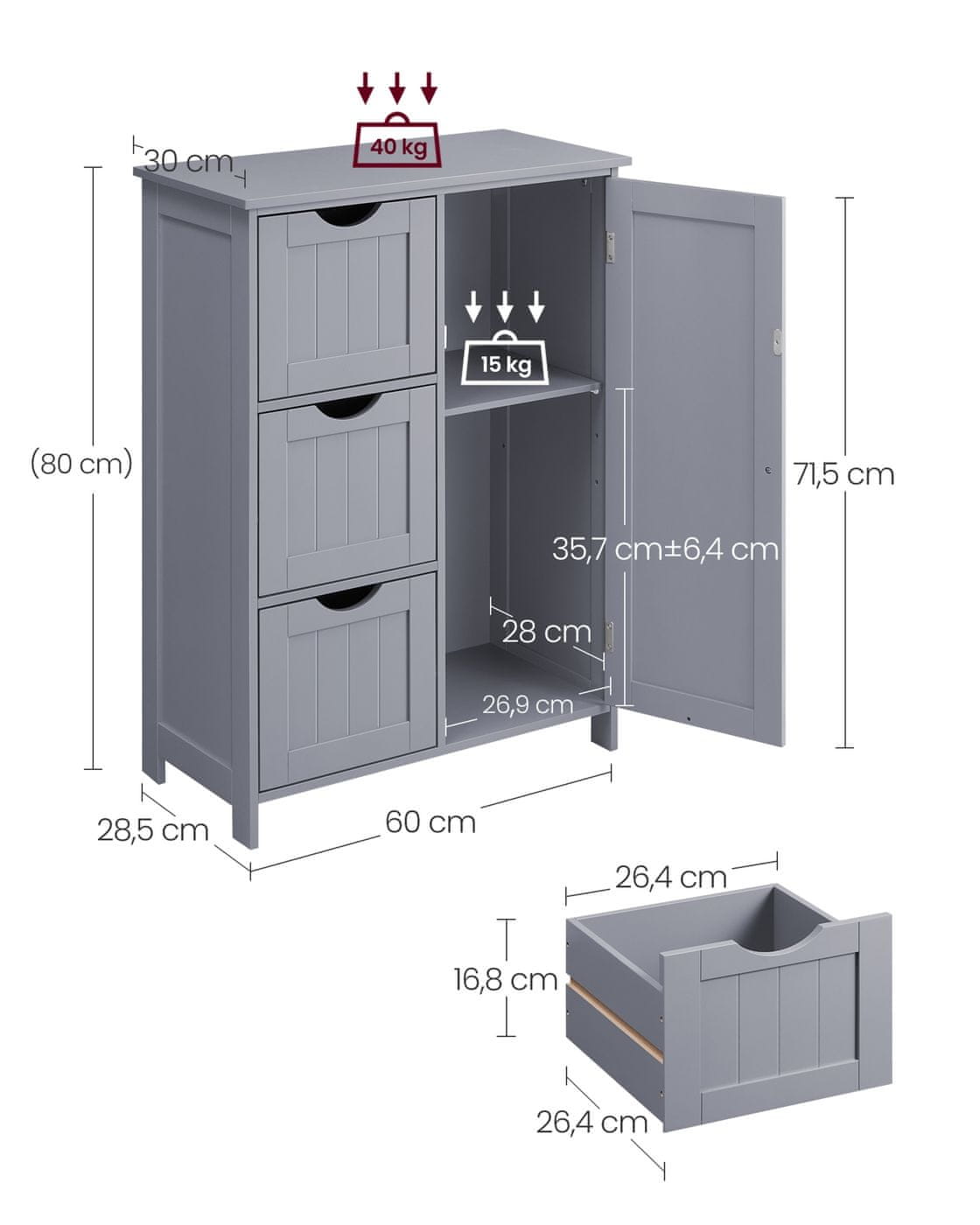 Ta vsestranski kabinet ponuja veliko prostora za shranjevanje z predali in omarico, zaradi česar je idealen za organizacijo vaše kopalnice, dnevne sobe, kuhinje ali hodnika. Njegova elegantna zasnova ustreza različnim notranjim prostorom in pomaga ohraniti vaš prostor urejen in brez nereda. Celoten opis