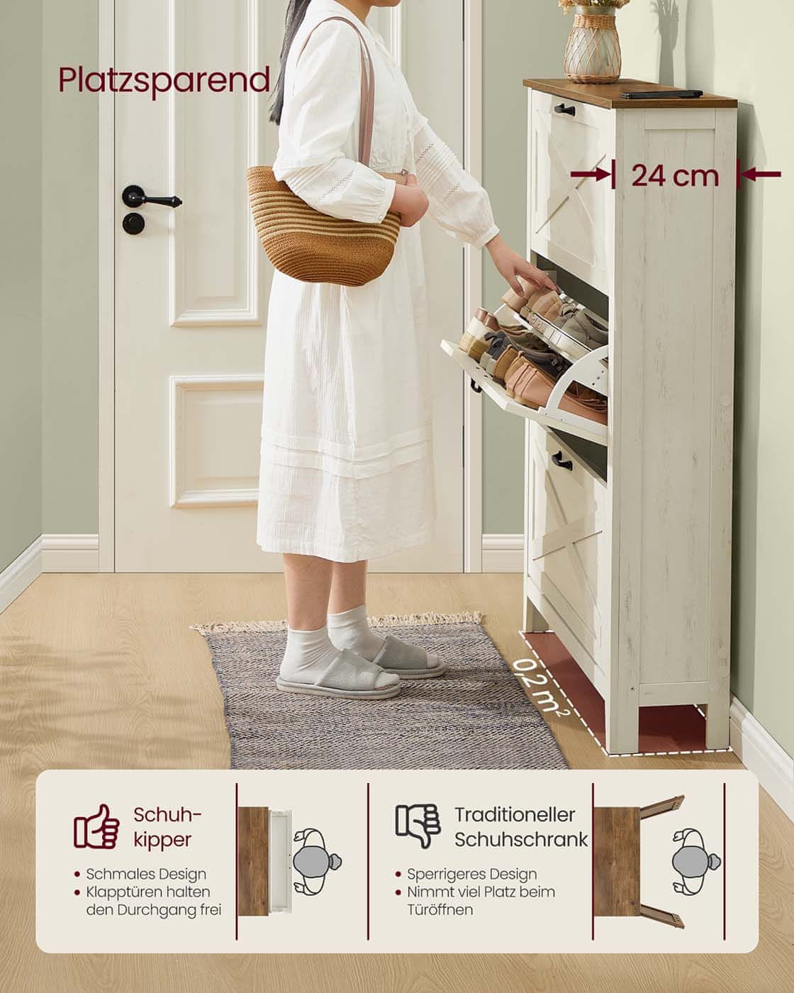 Ta õhuke kingakapikapp pakub praktilist hoiustamist teie esikusse, lisades samal ajal maalähedast stiili võlu. Selle ruumisäästlik disain aitab hoida kingad organiseerituna ja kergesti ligipääsetavana, muutes selle ideaalseks korrastatud ja stiilsete kodu sissepääsude jaoks. Celoten opis