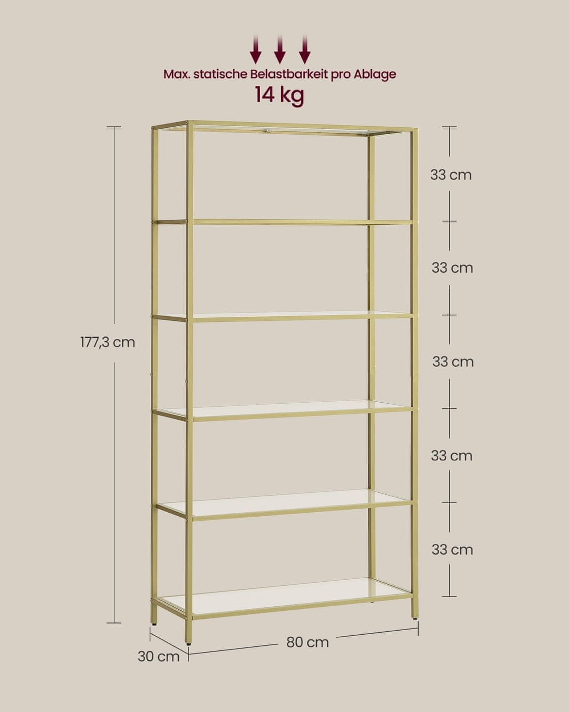 Ta regal z šestimi policami ponuja vsestransko rešitev za shranjevanje v različnih prostorih kot so kopalnica dnevna soba kuhinja ali pisarna. Oblikovan s policami iz kaljenega stekla in trdnim kovinskim ogrodjem združuje vzdržljivost z modernim prozornim kovinsko-zlatim videzom. Enostavna montaža ga naredi praktično izbiro za organizacijo in razstavljanje predmetov v vašem domu ali delovnem prostoru.