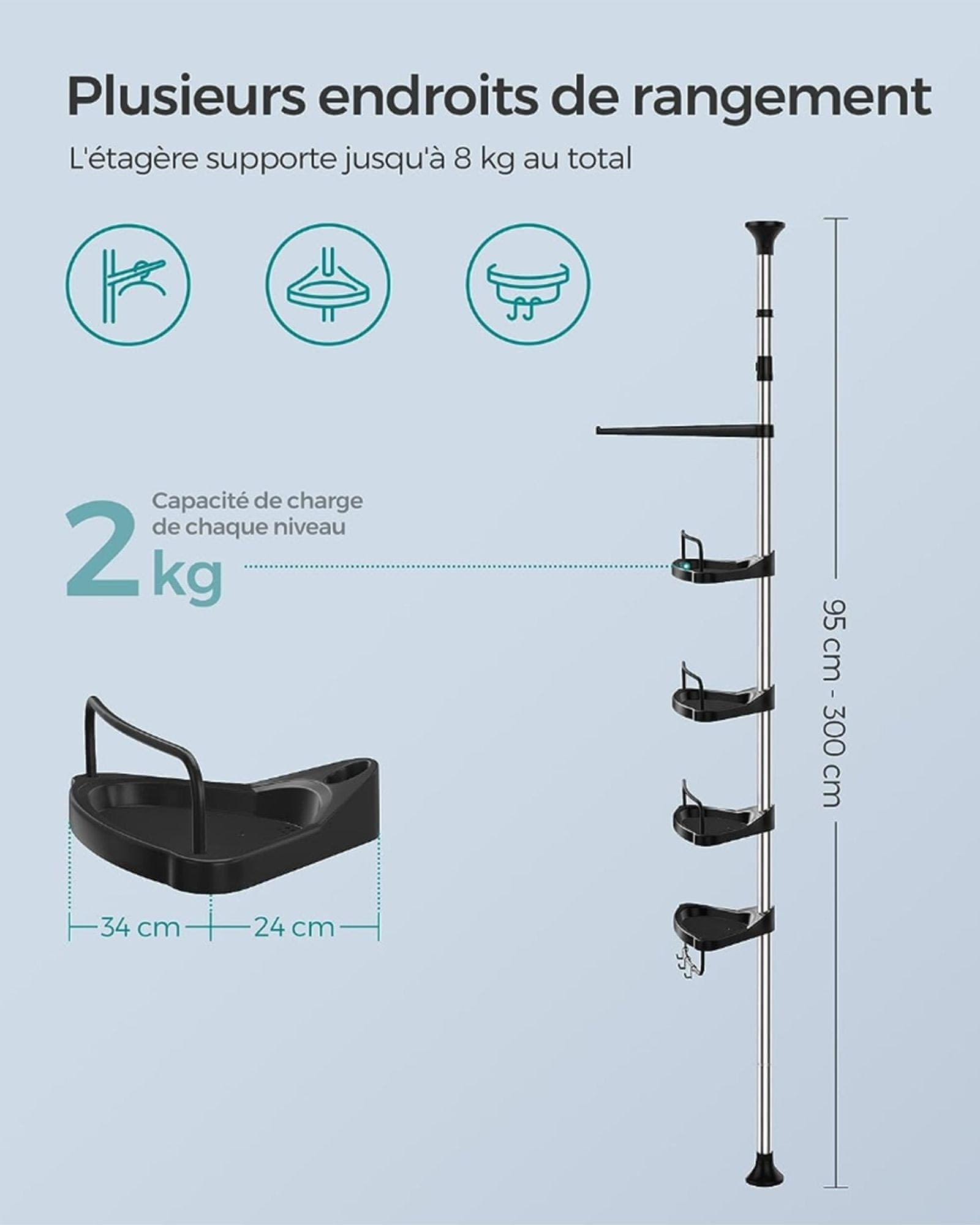 Songmics Polica za prho 24x34x95-300 cm srebrna nastavljiva