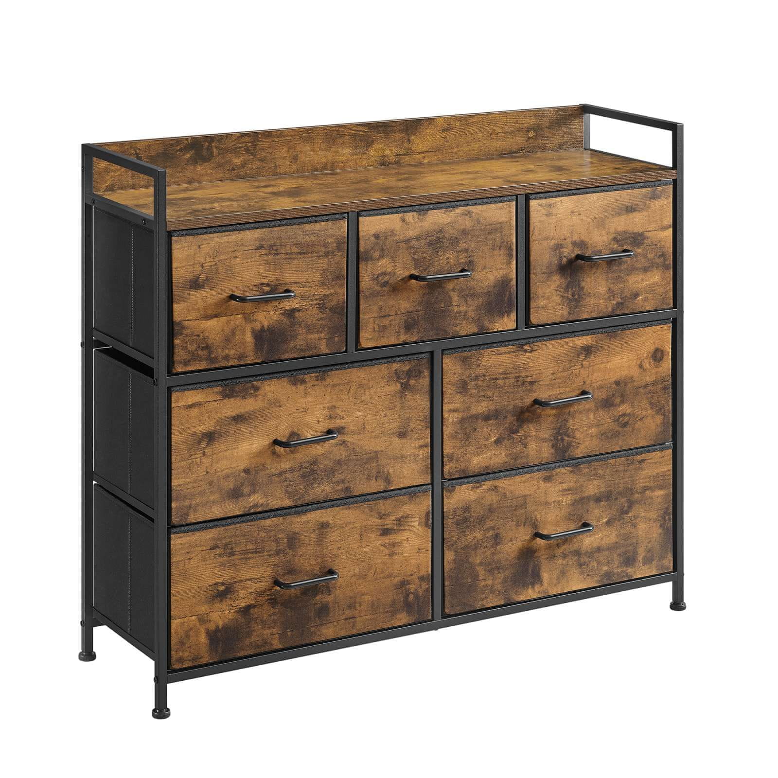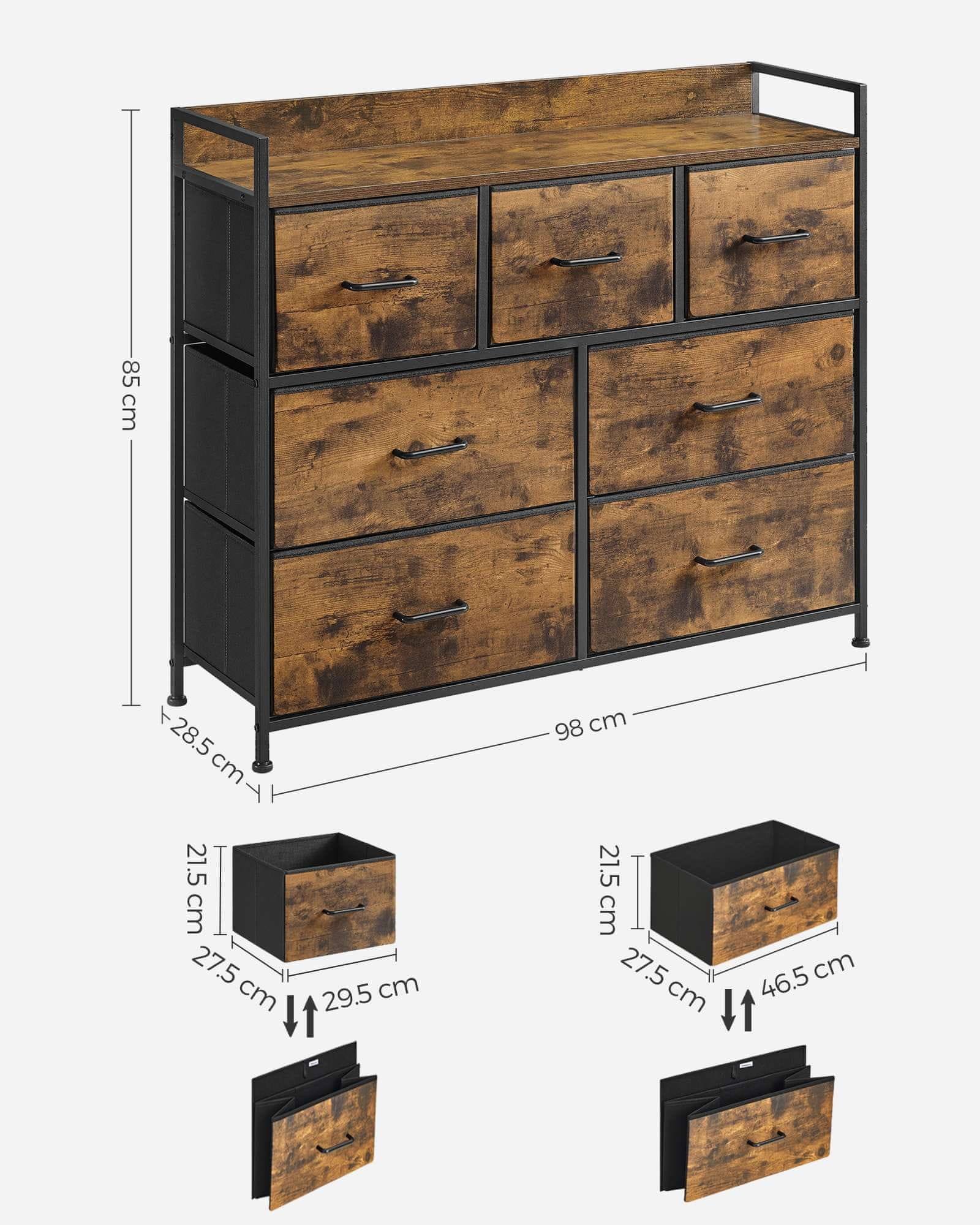Ta tekstilna komoda s predali ponuja stilsko in praktično rešitev za shranjevanje v vašem domu. Z zasnovo, ki združuje industrijske in rustikalne elemente, ima trdno kovinsko ogrodje in več predalov, ki vam pomagajo organizirati oblačila in dodatke v spalnici, hodniku ali dnevni sobi. Vsestranska zasnova in vzdržljiva konstrukcija omogočata dolgotrajno uporabo, saj zagotavljata funkcionalnost in estetski videz.