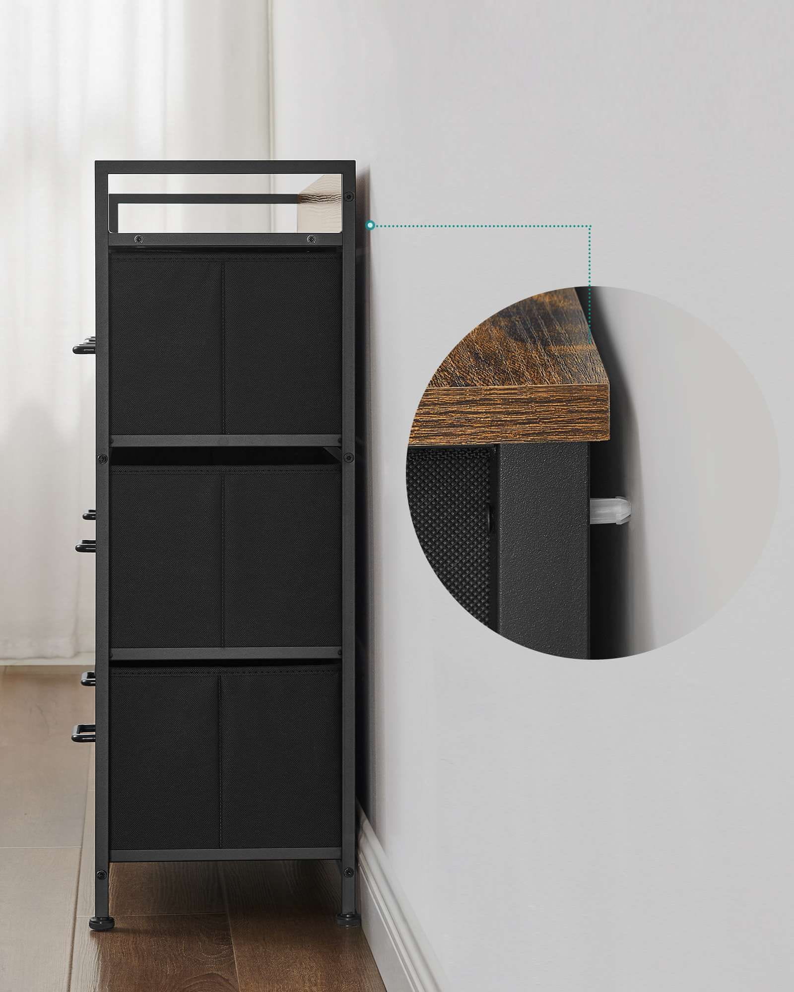 Ta tekstilna komoda s predali nudi praktično shranjevanje za vašo spalnico ali dnevni prostor ter vam pomaga učinkovito organizirati oblačila in potrebščine. Njena industrijska zasnova doda stilski pridih vsakemu prostoru, hkrati pa zagotavlja trpežno in dolgotrajno uporabo. Celoten opis