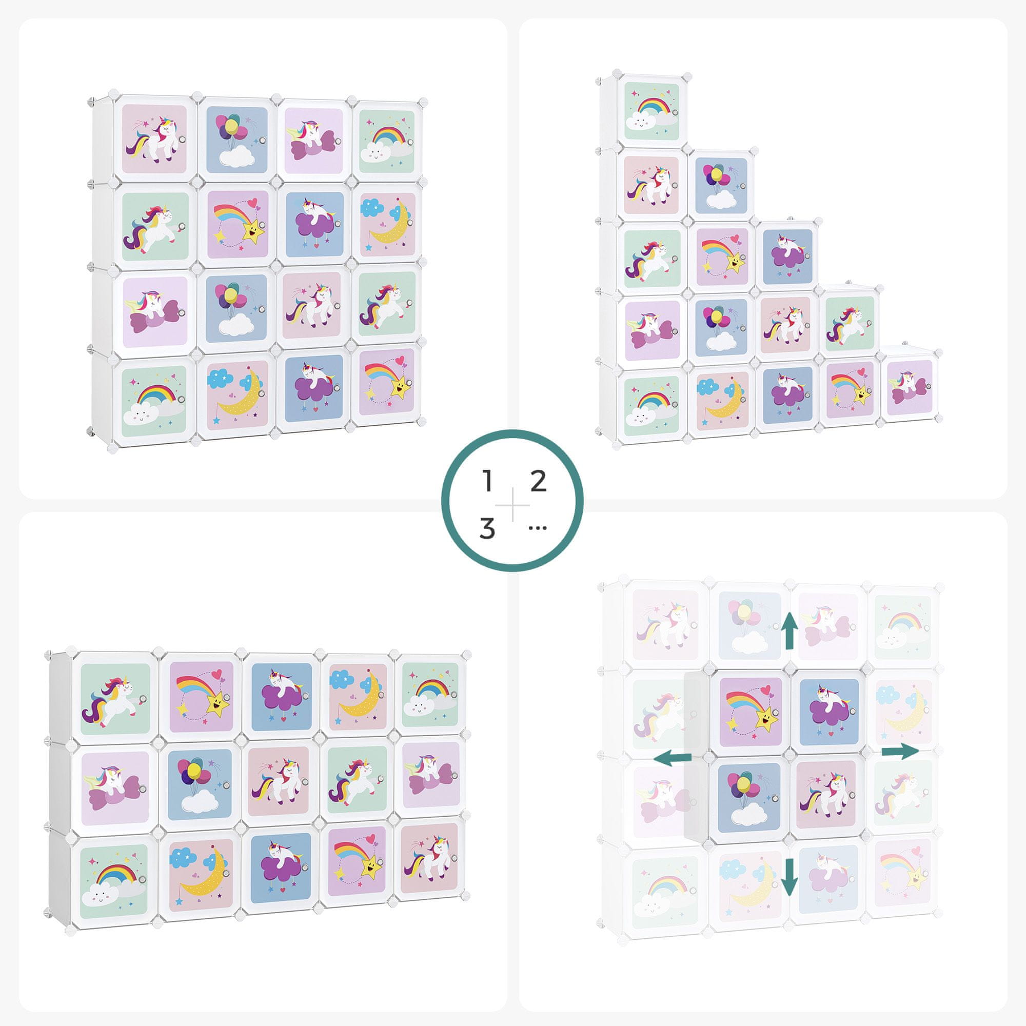 Ta modularni sistem shranjevanja kock je zasnovan za pomoč otrokom pri ohranjanju urejenosti in organiziranosti njihove sobe. Ponuja vsestranske možnosti shranjevanja za oblačila igrače knjige in čevlje ter ga je mogoče prilagoditi različnim prostorom. Igriv dizajn in svetle barve ga naredijo privlačen in funkcionalen dodatek vsaki otroški sobi.