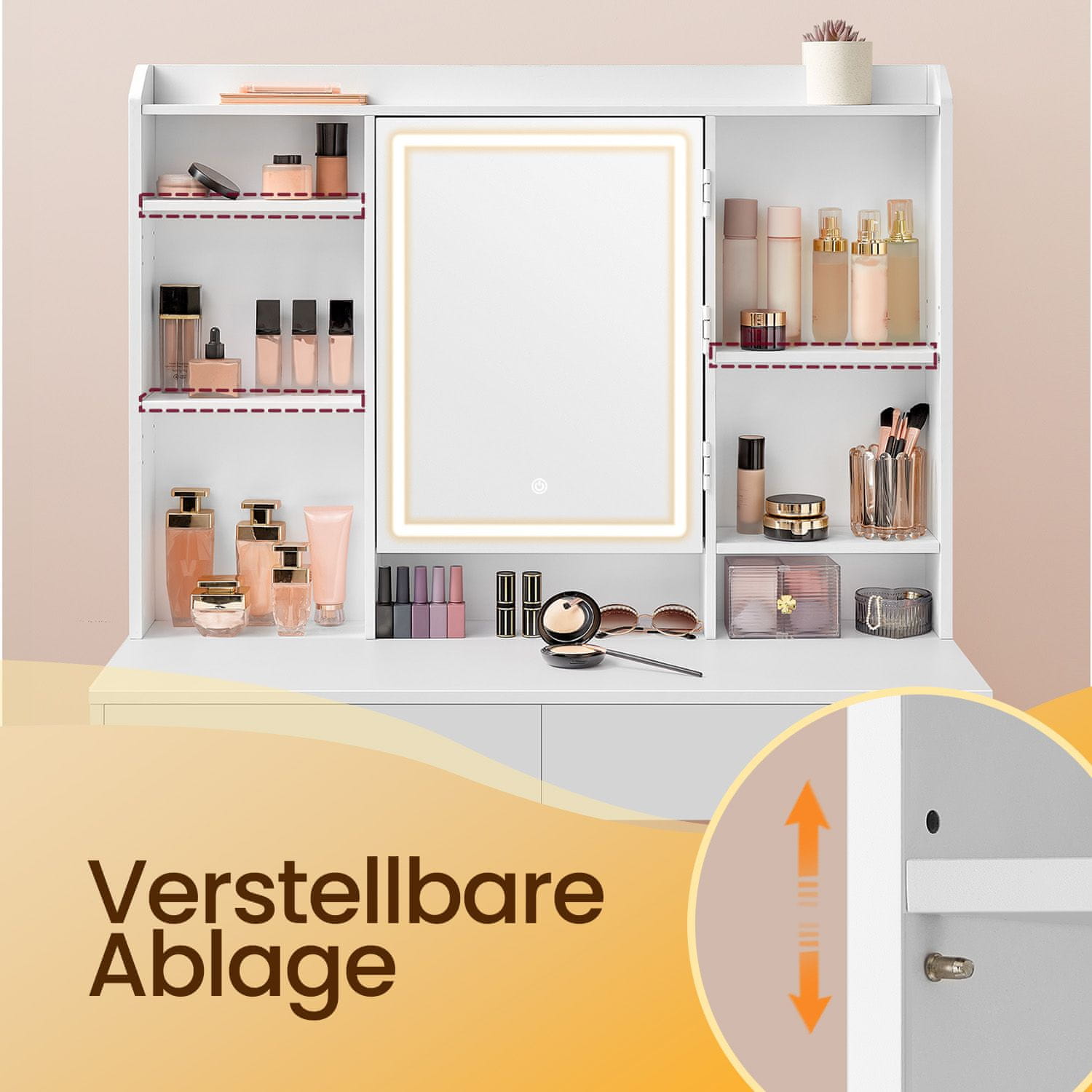 Ta sodobna toaletna mizica je zasnovana tako da zagotavlja moderen in funkcionalen prostor za vašo dnevno lepotno rutino. Opremljena je z velikim ogledalom z nastavljivo LED osvetlitvijo ki omogoča optimalno vidljivost pri nanašanju ličil in urejanju. Več predalov odprtih predelkov in nastavljive police zagotavljajo urejeno shranjevanje kozmetike in dodatkov.
