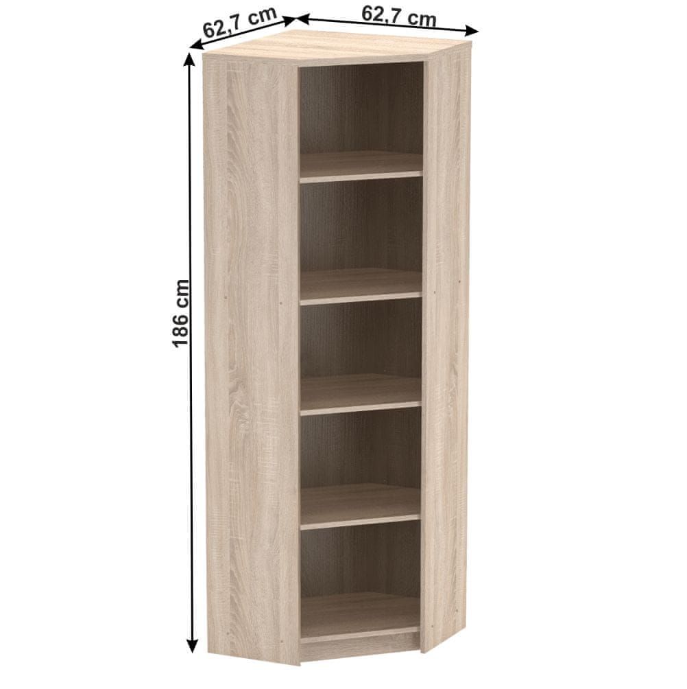 Naj bo vaš delovni čas prijetnejši s kotno polico JOHAN 2 NEW 09. Opozorite na eleganten dizajn in čudovite čiste linije. Izdelan je iz DTD (iverne plošče) laminirane z ABS robovi v dezenu hrast sonoma. Je kvaliteten slovaški izdelek. Če želite imeti svoje registratorje in svežnje dokumentov lepo pospravljene, za vas izberemo kotni pisarniški regal Johan 2 new 09. Njegove dimenzije (ŠxGxV): 62,7×62,7×186 cm. Ponuja vam veliko prostora za shranjevanje v obliki petih odlagalnih površin, ki tvorijo štiri police. Debelina materiala je 16 in 22 mm, največja nosilnost polic pa je 5 kg. Dobavljeno s spodnjim podnožjem. Polica je dostavljena razstavljena. Pisarniški sistem Johan New ponuja celotno paleto pohištva za vašo pisarno, od garderobnih omar, miz in polic do zabojnikov za shranjevanje. Je kvaliteten slovaški izdelek. Dolge ure posvečamo delu, bodisi doma ali v pisarni. Zato ne gre podcenjevati izbire pravega pohištva.