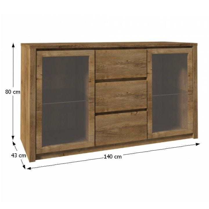 Komoda MONTANA K2D je praktična komoda z dvojimi steklenimi vrati in tremi predali na sredini, ki jo lahko kombinirate z drugimi elementi iz modelne linije Montana. Sistem Montana je univerzalna in tradicionalna sekcijska garnitura, s katero lahko opremite dnevno sobo, spalnico, jedilnico ali pisarno. Material za izdelavo je laminiran DTD v barvi lefkas hrast temni, posamezne elemente garniture pa lahko naročite tudi v barvi hrast sonoma tartuf. Elementi garniture se odlično kombinirajo s policami Alano, saj imajo enako materialno osnovo in videz površine. Vrata in predali so brez ročajev, kar poudarja čist in preprost dizajn pohištva. Robovi pohištva so obrobljeni z ABS obdelavo.