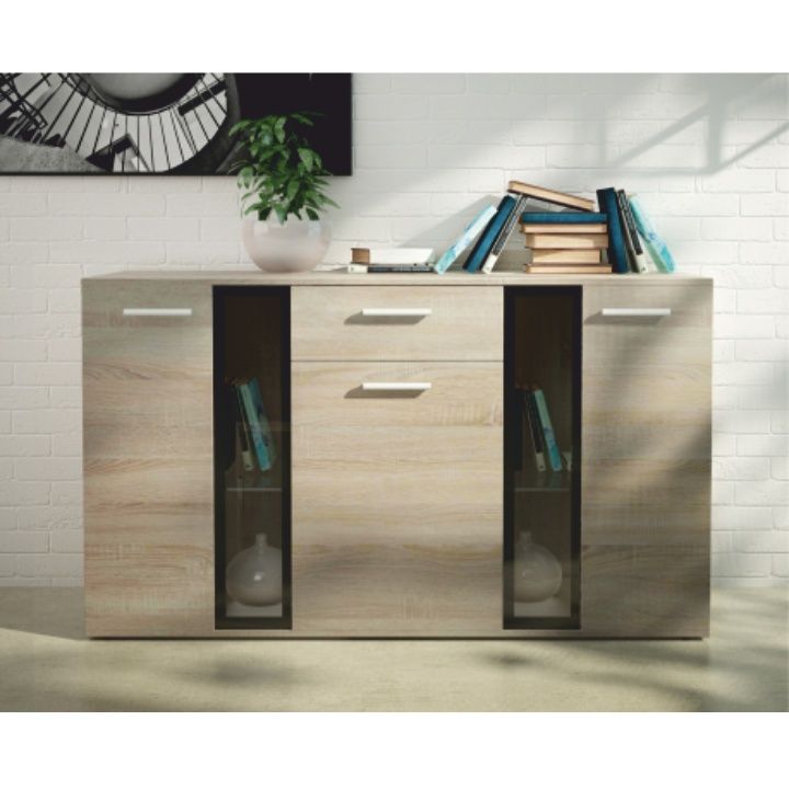 Moderna komoda SALESA je sestavljena iz dvojih delno zastekljenih vrat, enih masivnih vrat in praktičnega predala. Material za izdelavo je visokokakovosten laminiran DTD v barvi hrasta sonoma. Priporočamo nakup LED osvetlitve (moder podton) za komodo, ki poudari predmete v notranjosti vrat in ustvari prijetno vzdušje v celotnem prostoru.