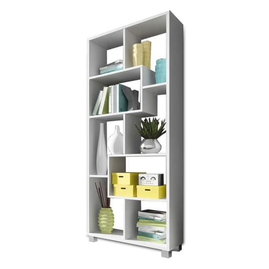 Moderni regal ADEN je večnamenski regal, ki zagotavlja veliko prostora za shranjevanje knjig, rož, okrasnih predmetov in drugih drobnarij. Regal je primeren za postavitev v dnevni sobi, delovni sobi ali pisarni, pa tudi v otroški ali študentski sobi. Izdelan je iz laminiranega DTD v beli barvi, na voljo pa so tudi druge barve. Regal je univerzalen in ga lahko odlagate navpično (68,5×25×161,3 cm) in vodoravno (156,3×25×73,4 cm).