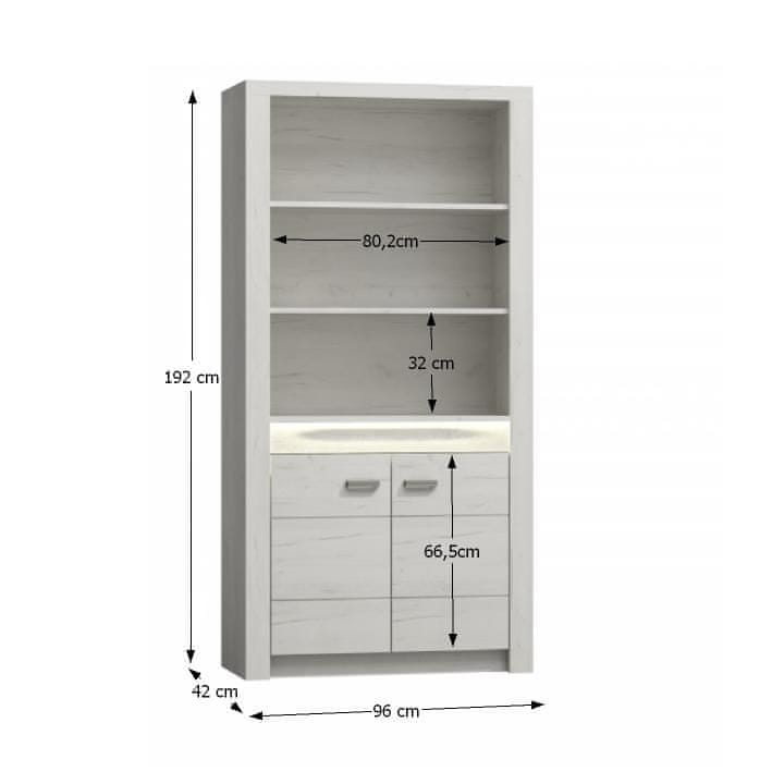 Vitrina INFINITY 05 je dvovratna vitrina z dvema policama, ki jo lahko kombinirate z ostalimi elementi iz modelne linije Infinity. Za vitrino je možno naročiti LED osvetlitev. Sistem Infinity je razkošen visokokakovosten sektorski sklop v masivni izvedbi z elementi iz surovega barvanega lesa z izrazitim reliefnim vzorcem. Posamezne elemente lahko uporabimo za opremljanje dnevnih in jedilnic. Material za izdelavo je laminiran DTD v beli barvi pepela, na izbiro pa sta še dve različici: svetla pepel in temno pepel. Telo kompleta ima debelino do 48 mm. Robovi so obrobljeni z ABS obdelavo. Vrata in predali so opremljeni s kovinskimi ročaji.