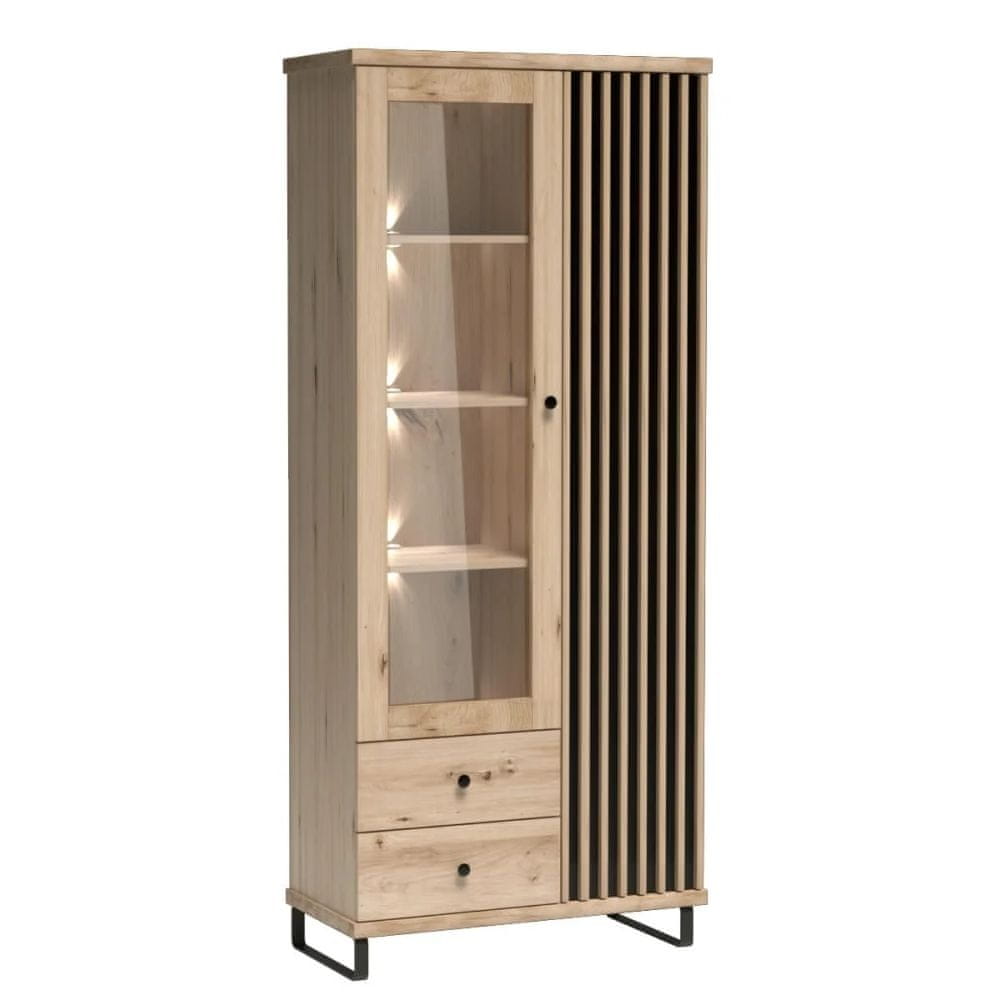 Vitrina Koli C-2, izdelana iz kakovostnega laminiranega DTD, MDF in stekla, združuje vzdržljivost z estetskim videzom. Svetla barva lesnega hrasta v kombinaciji s črnimi detajli daje pohištvu sodoben videz, ki se prilega različnim tipom interierjev.