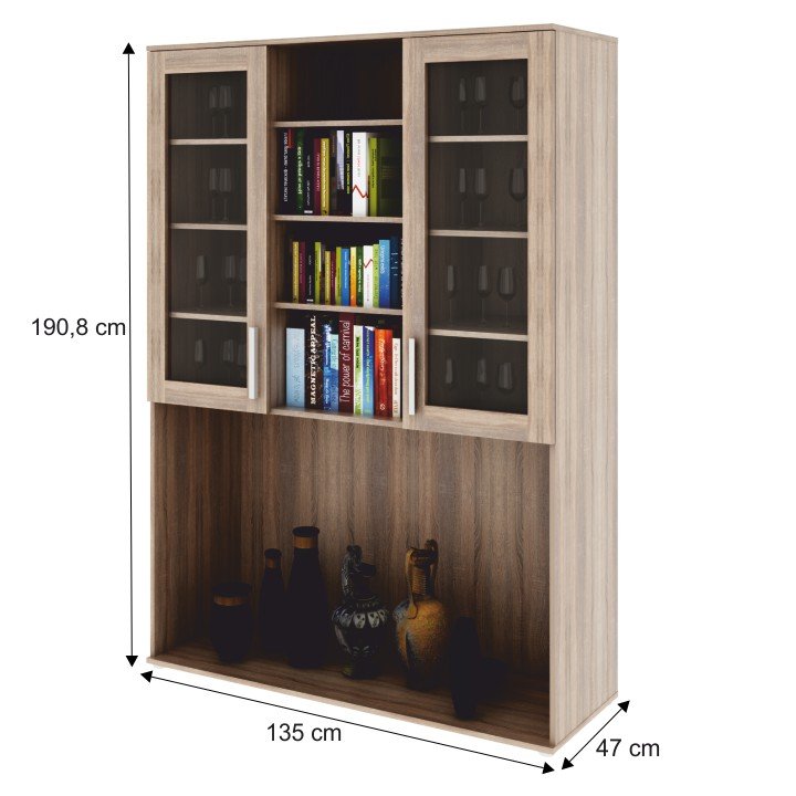Prizidek omare DUNAJ TYP 6 je dvovratna vitrina s tremi policami na sredini in prostorom za TV ali dekoracije in dodatke. Postavitev lahko kombinirate z drugimi elementi iz modelne linije Dunaj. Sistem Dunaj je univerzalno praktično sekcijsko pohištvo, primerno za opremljanje dnevnih sob. Je visokokakovosten slovaški izdelek, ki zagotavlja maksimalno prostoren prostor za shranjevanje do višine 240 cm. Material za izdelavo je laminiran DTD v barvi hrasta sonoma. Montaža je zaključena s kovinskimi ročaji. Za omaro Dunaj Tip 2 in nadgradnjo Dunaj Tip 5 lahko naročite police (4 kosi v paketu) dimenzij 87×45×1,6 cm.