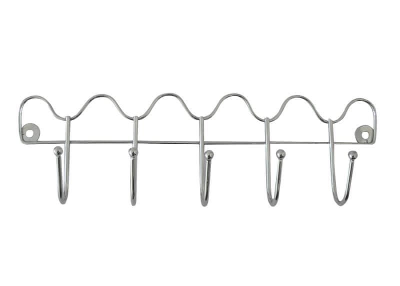 Kromiran žični obešalnik s 5 kavlji. Oblika vala, zaključek kavljev s kroglicami. Dimenzije 35 × 10 cm. Vključen je montažni material. EAN 8591177000785