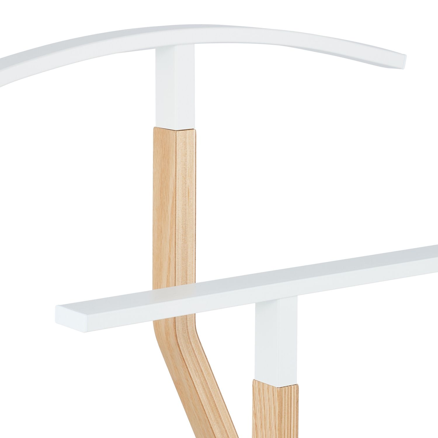 Odkrijte popolno rešitev, da vaša oblačila ostanejo brez gub z našim elegantnim obešalnikom za oblačila. Ta stojalo je idealen za vašo poslovno obleko in vam pomaga organizirati oblačila v stilu. Suknjič, srajco ali bluzo obesite na širok obešalnik, da se izognete gubam. Ukrivljena ograja za hlače ne le ohranja gladke hlače, ampak omogoča tudi prostor za ujemajočo se kravato. Za red in red postavite obešalnik za oblačila v spalnico, garderobo ali predsobo. Dizajn iz bele kovine in lesa je hkrati funkcionalen in estetski dodatek vašemu domu.