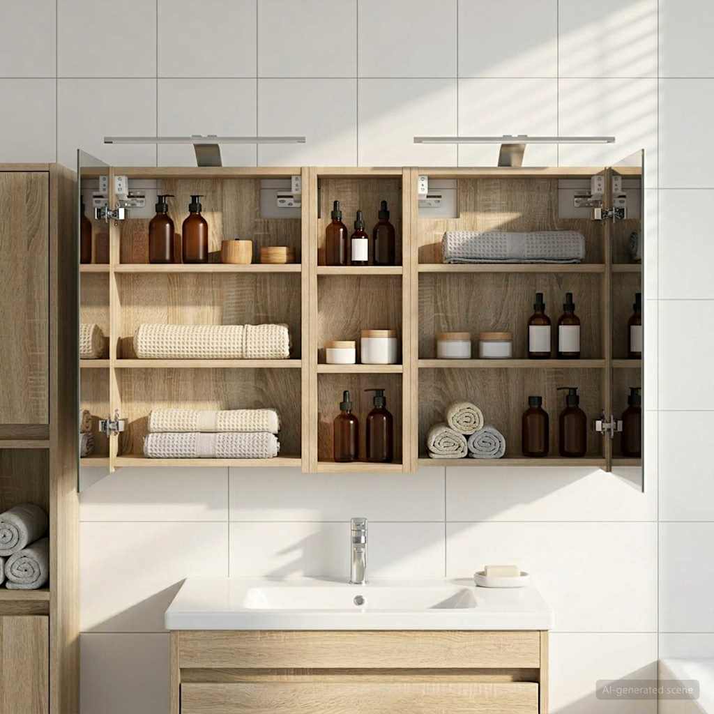 • Obsežen prostor za shranjevanje Zasnovana za optimalno izkoriščenost, ta kopalniška omarica ponuja široko kapaciteto shranjevanja z več policami in vrati na tečajih. Premislena postavitev omogoča enostavno organizacijo toaletnih potrebščin, tako da je vse pri roki. Njena prostorsko učinkovita zasnova povečuje funkcionalnost kopalnice z zmanjšanjem nered.