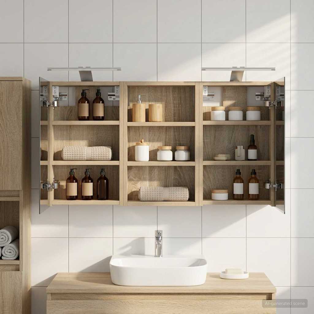 • Obsežen prostor za shranjevanje Zasnovana za optimalno izkoriščenost, ta kopalniška omarica ponuja široko kapaciteto shranjevanja z več policami in vrati na tečajih. Premislena postavitev omogoča enostavno organizacijo toaletnih potrebščin, tako da je vse pri roki. Njena prostorsko učinkovita zasnova povečuje funkcionalnost kopalnice z zmanjšanjem nered.