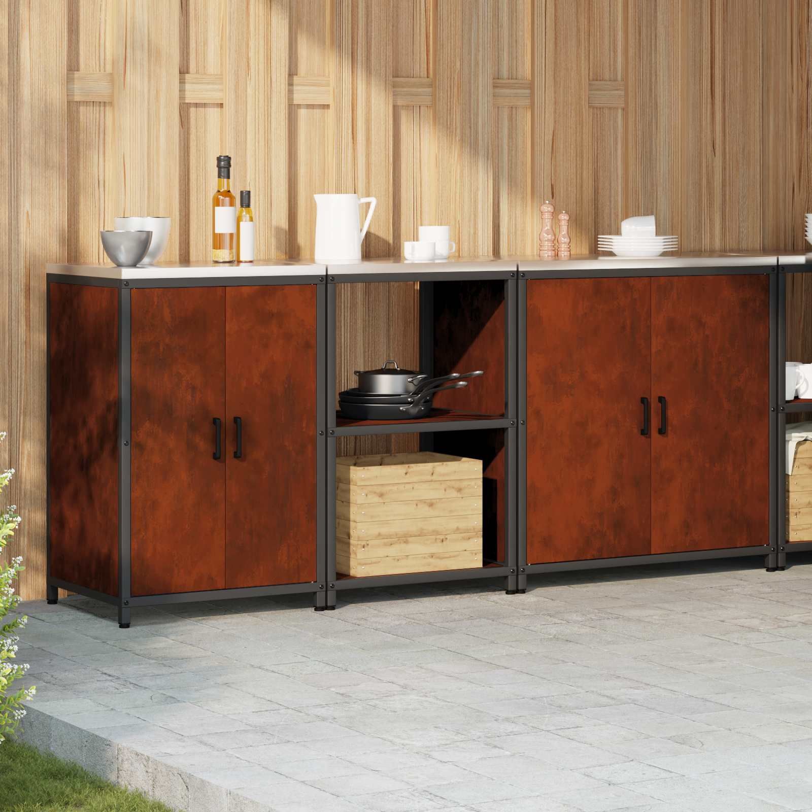 • Vključene komponente: Omarica ima več polic in predelkov, oblikovanih za različno shranjevanje – od loncev do hrane. Jeklene police povečujejo stabilnost in nudijo zanesljivo podporo za težke predmete, medtem ko trdne jeklena vrata zagotavljajo močno zaključek.