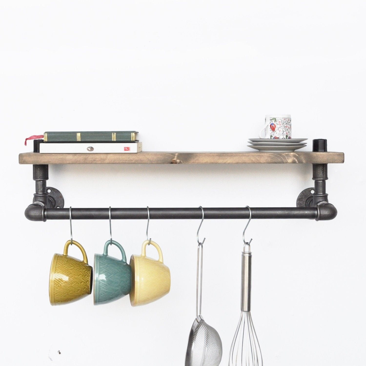 100 % SMREKOV LES Cev: 100 % KOVINA Ročna izdelava Širina: 60 cm Višina: 20 cm Globina: 14 cm Lahko se pritrdi na steno Sestavljeno Nosilnost: 2,50 kg