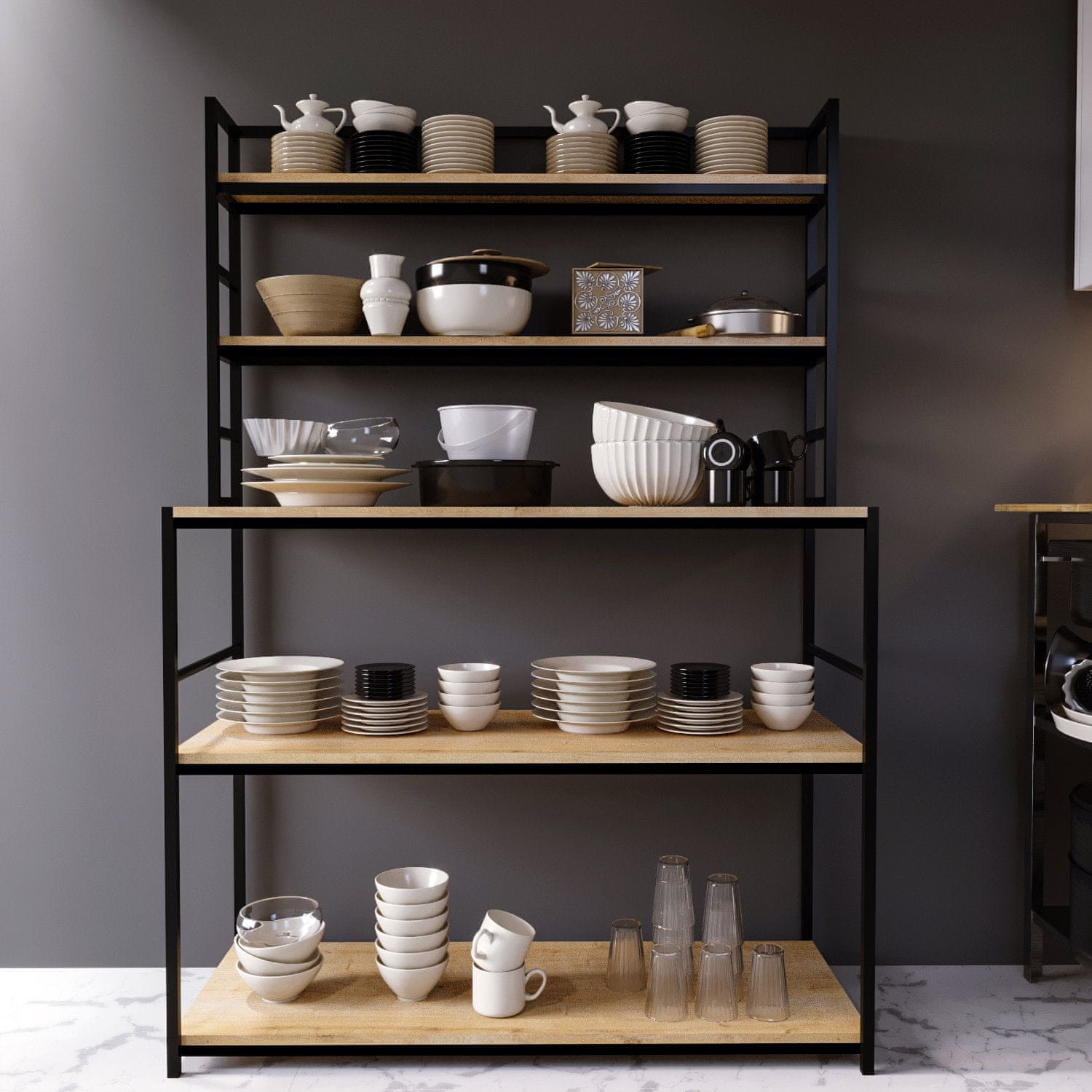 100 % MELAMINSKO PREVLEČENA IVERNA PLOŠČA Debelina: 18 mm Elektrostatično prašno prevlečene kovinske noge Širina: 120 cm Višina: 160 cm Globina: 50 cm Višina zgornje police: 30 cm Višina spodnje police: 50 cm Številne police Možnost pritrditve na steno