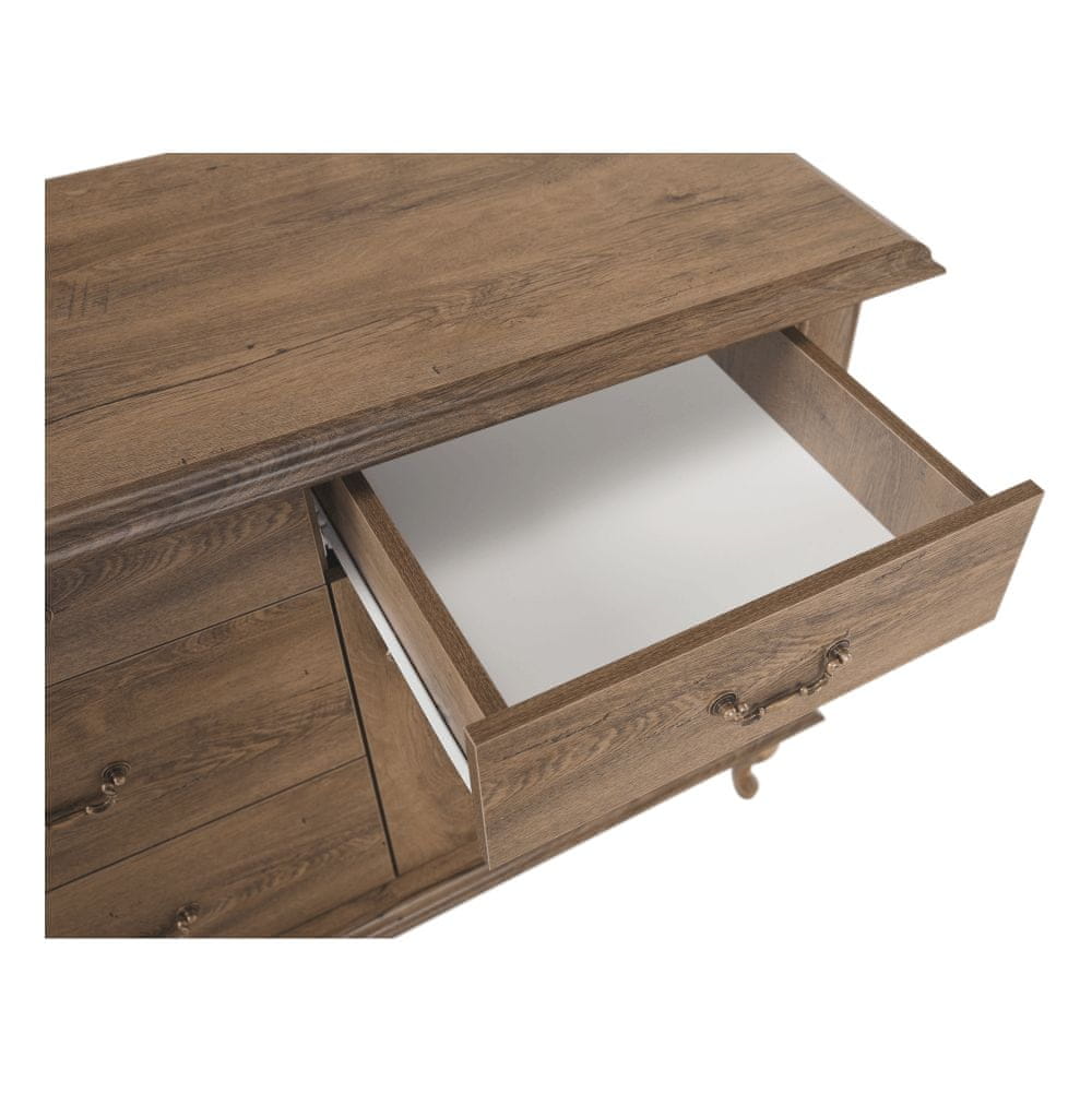 Eden od sestavnih delov čudovitega sekcijskega pohištva je dvovratna komoda s predali VILAR DA7. Njene dimenzije (ŠxGxV): 165×47×89 cm, višina spodnjega prostora od tal je 15 cm. Trdne lesene noge mu dajejo stabilnost, za odpiranje pa poskrbijo dizajnerski kovinski ročaji. Predalnik ponuja prostor za shranjevanje v obliki petih predalov in dveh enovratnih omaric. Če želite reprezentativno bivanje, si oglejte segmentno pohištvo VILAR. V baročnem stilu in s 3D učinkom doda prostoru pridih razkošja, zahvaljujoč kateremu bo vaša dnevna soba videti razkošno in razkošno. Dekorativni elementi izgledajo romantično in ekskluzivno. Pohištvo je izdelano iz laminirane DTD (iverne plošče) debeline 30 mm z masivnimi ABS robovi. Dizajn hrasta Lefkas se bo čudovito zlil z vsakim interierjem. Ustvarite pravo toplino svojega doma s tem čudovitim sektorjem. Z njim lahko okrasite svojo jedilnico, pa tudi dnevno sobo.