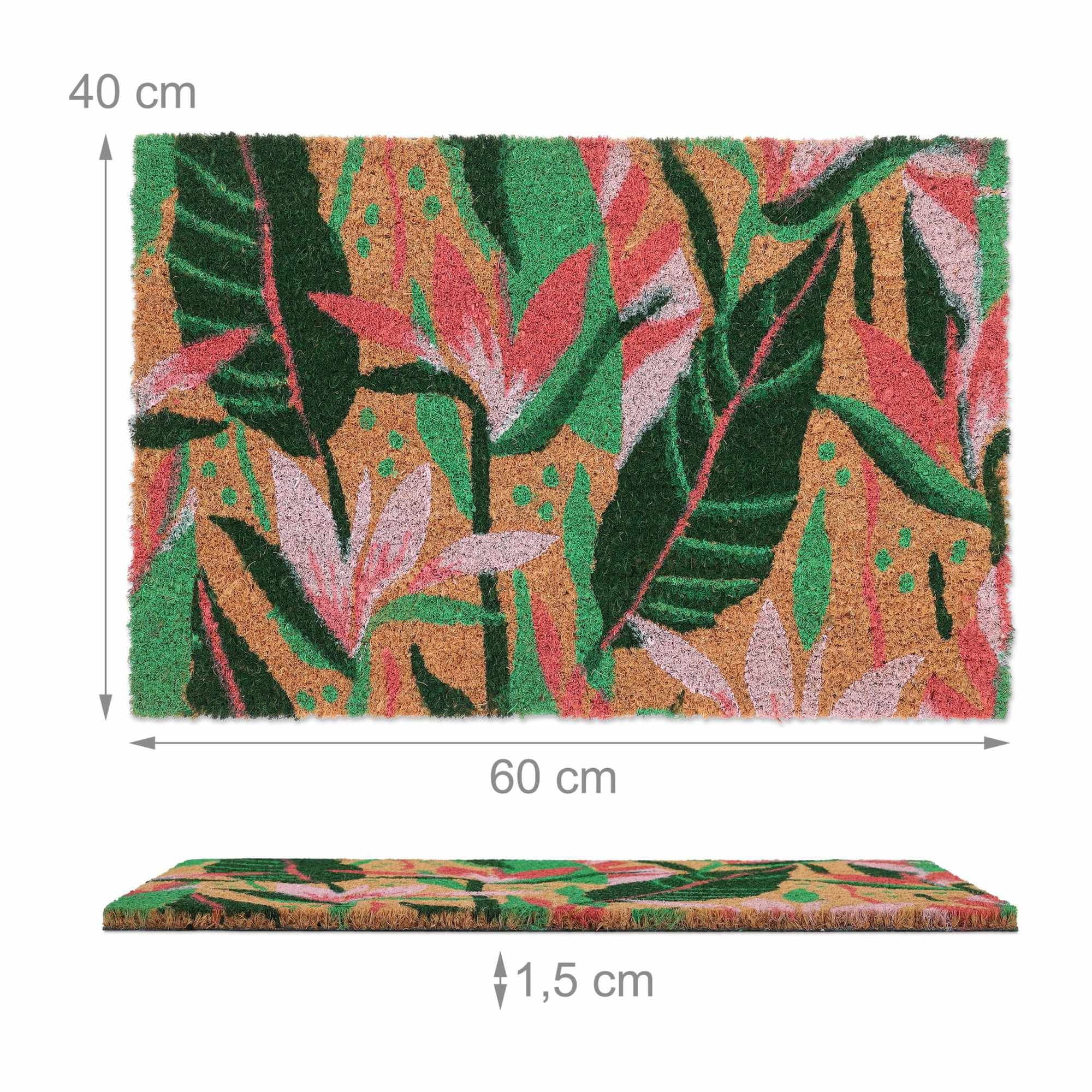 Polepšajte svoj vhod z nedrsečim predpražnikom z rastlinskim motivom, izdelanim iz trpežnih kokosovih vlaken za notranjo in zunanjo uporabo. Ta podloga učinkovito zadržuje umazanijo in ohranja vaš dom čist.