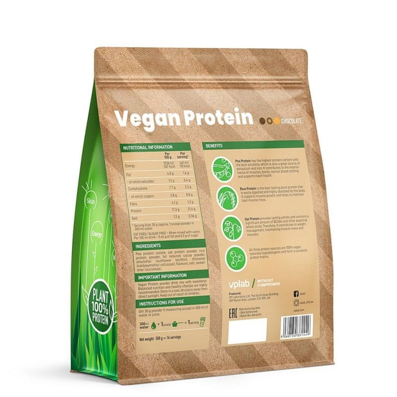 VPLab veganski proteini z okusom čokolade so mešanica 3 rastlinskih virov beljakovin – grahovih, ovsenih in riževih beljakovin v prahu. Pakiranje zadostuje za 16 serviranj: Celoten opis