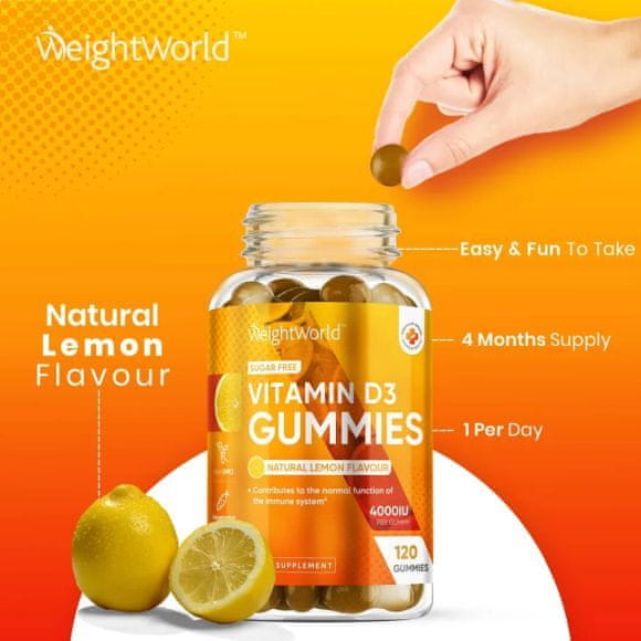 Ste zaužili dovolj “sončnega vitamina”? Vitamin D3 je eden redkih vitaminov, ki jih je težko najti v naravi. Zato smo razvili naše naravne gumijaste bonbone z vitaminom D3 z okusom limone. S samo enim okusnim gumijem na dan lahko dobite ves vitamin D3, ki ga vaše telo potrebuje! Okrepite, napolnite z energijo in dajte svojemu telesu sonce, ki ga potrebuje že danes!