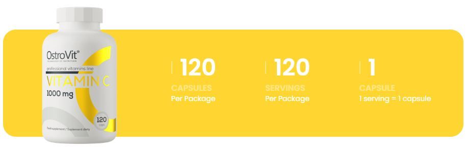OstroVit Vitamin C 1000 mg 120 kapsul: je visokokakovostno prehransko dopolnilo, ki je vir L-askorbinske kisline. Izdelek v obliki kapsul, odlikuje pa ga preprosta sestava, ki ne vsebuje nepotrebnih dodatkov. Namenjen je telesno aktivnim in tistim, ki jih odlikuje povečana potreba po vitaminu C.