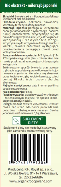 Organski izvleček ginka bilobe znamke Royal Brand je naravno prehransko dopolnilo v tekoči obliki, pridobljeno s postopkom hladne ekstrakcije z uporabo 70 % organskega alkohola. Ta metoda ohranja celoten spekter aktivnih rastlinskih sestavin, kot so flavonoidi, katehini, terpenski laktoni in bilobalid.