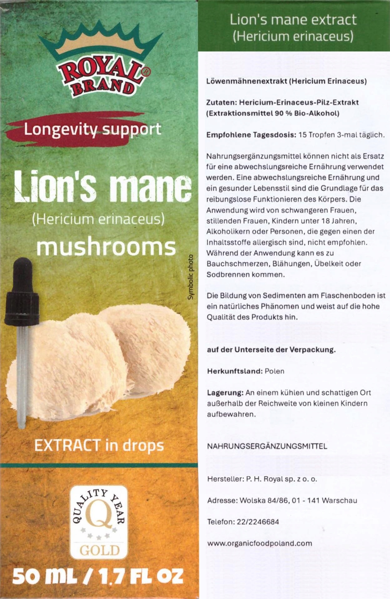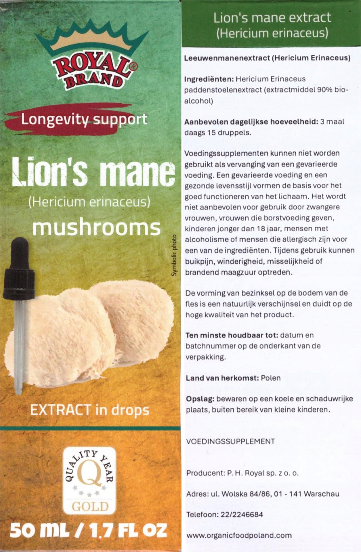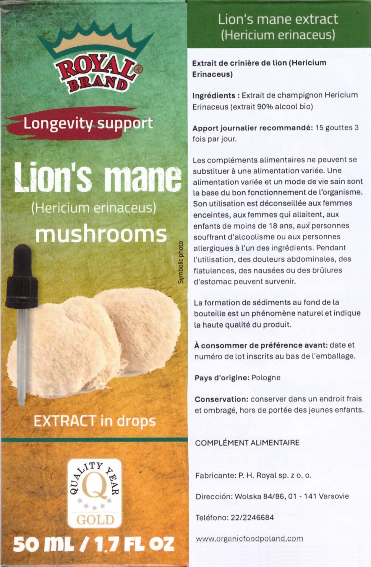 Royal Brand je poljska blagovna znamka, katere poslanstvo je zagotavljati izdelke najvišje kakovosti v harmoniji z naravo. Ponosno predstavljamo naš hidroalkoholni izvleček levje grive (Hericium erinaceus), pridobljen izključno iz plodišč gob. Vsaka 50 ml steklenička vsebuje koncentriran, visoko učinkovit izvleček levje grive v razmerju 10:1, ki podpira zdravje možganov, imunost in zmanjšanje stresa.