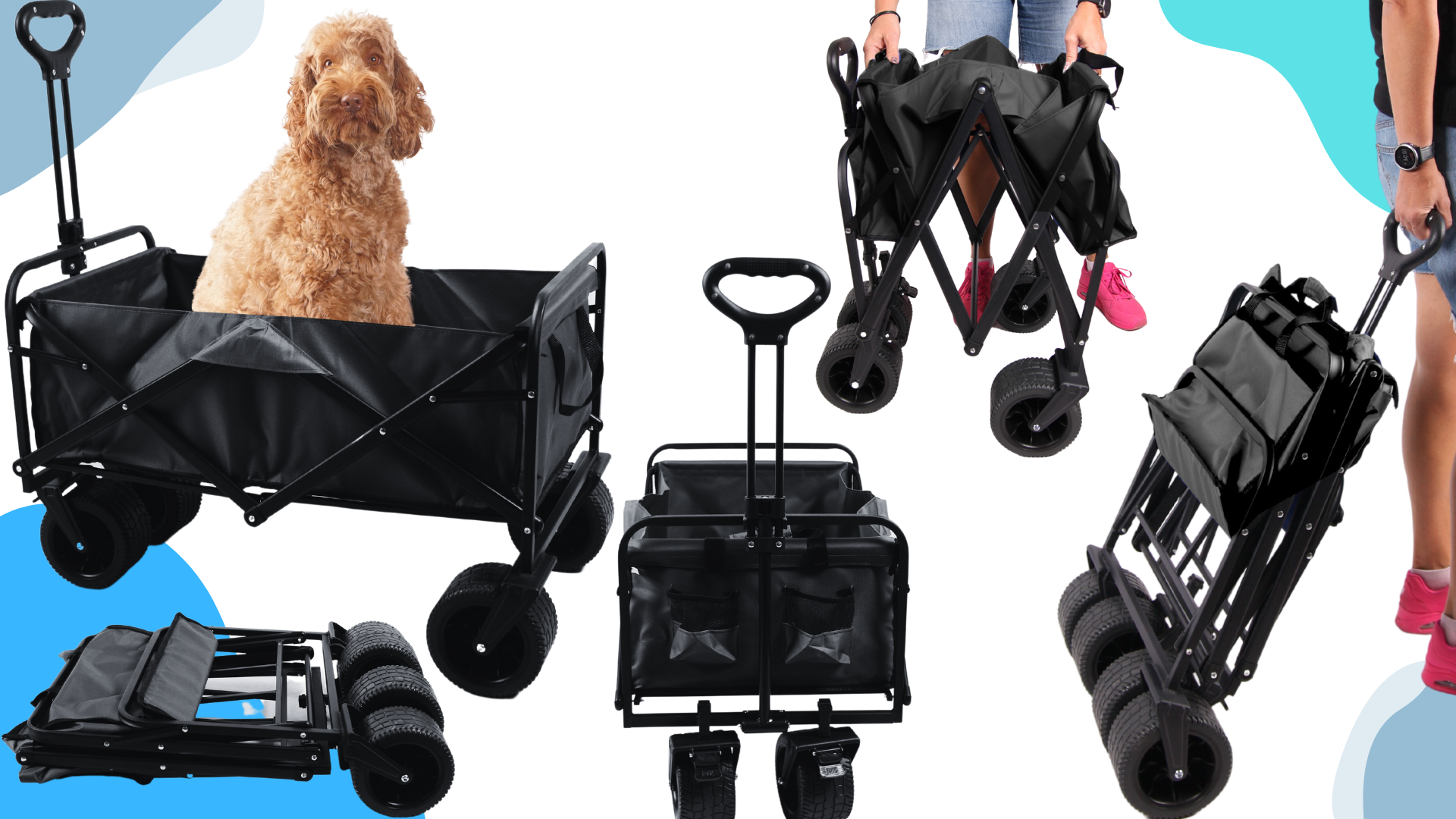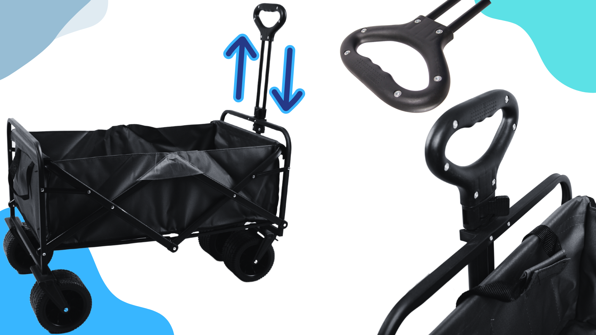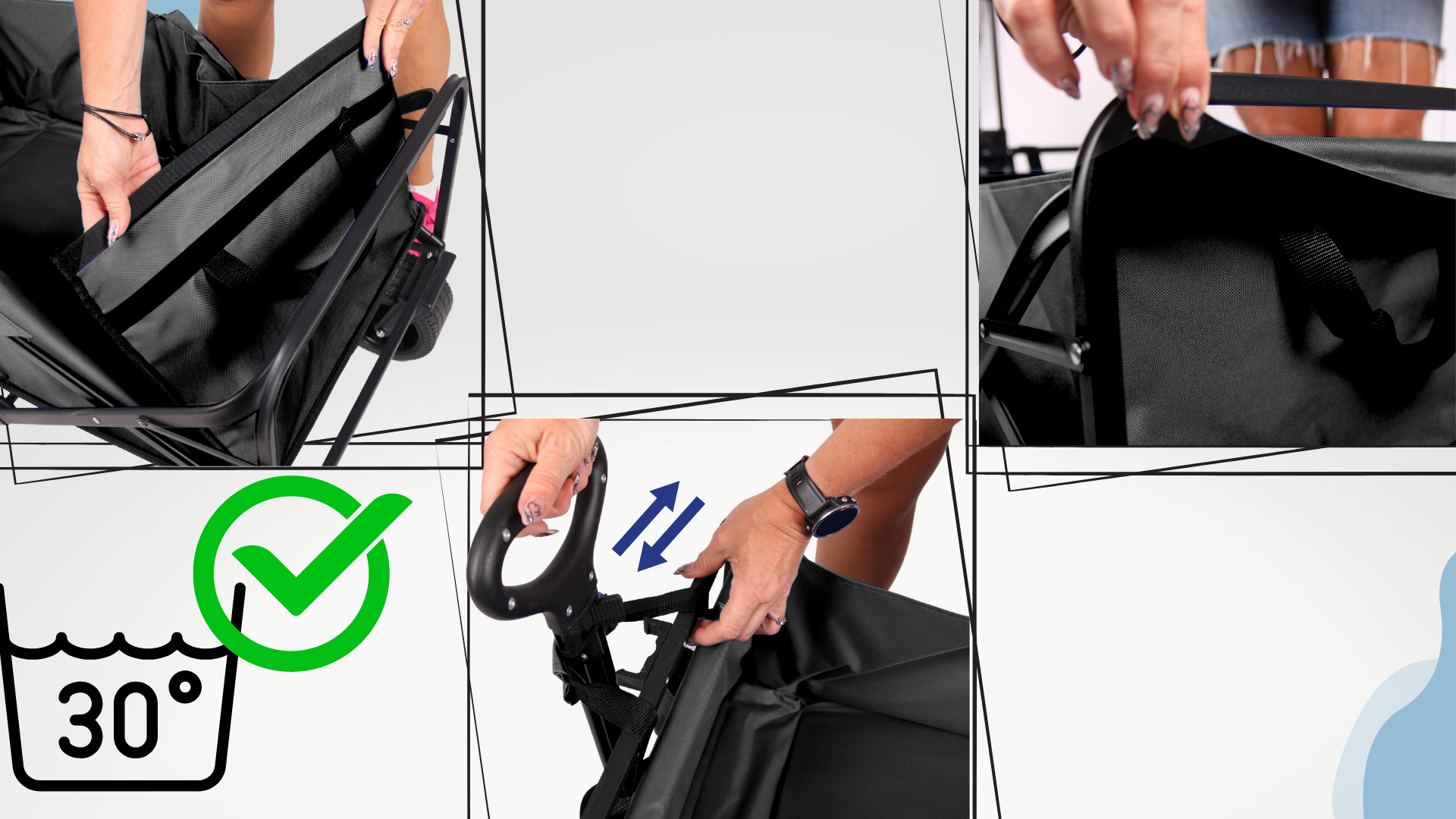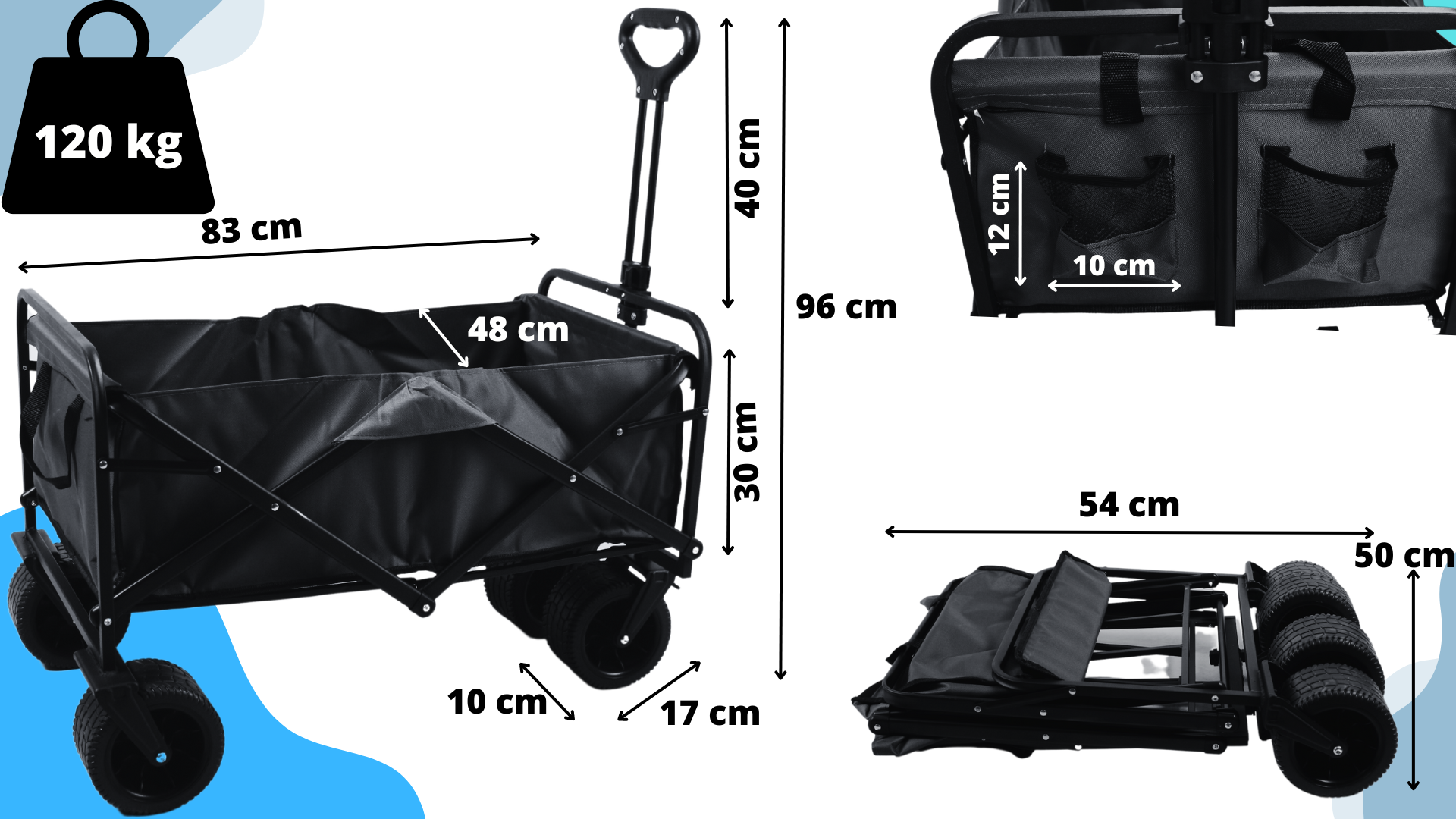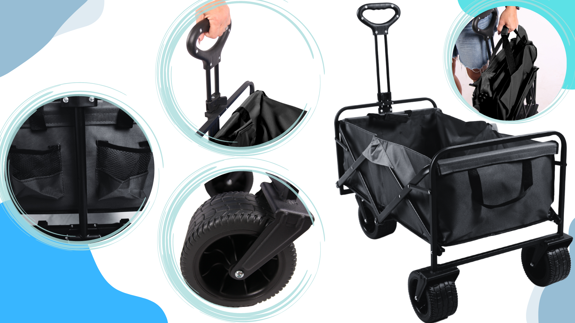 • ✅Zložljiv – zelo enostavno, z eno roko. Ko je zložen, ga lahko enostavno pospravite v prtljažnik avtomobila ali shranite na majhnem prostoru. Poleg tega je voziček opremljen z lahko dostopnimi ročaji za prenašanje, ko je zložen.