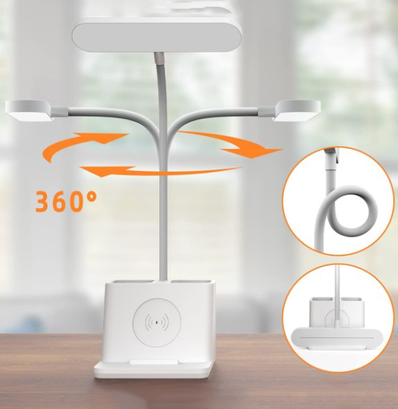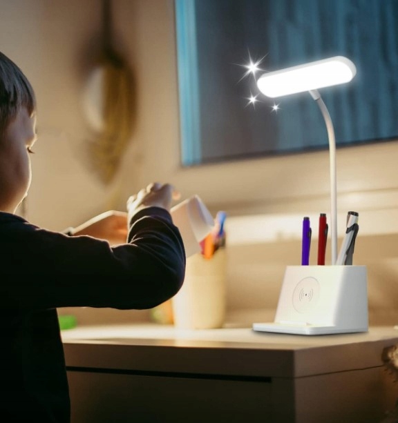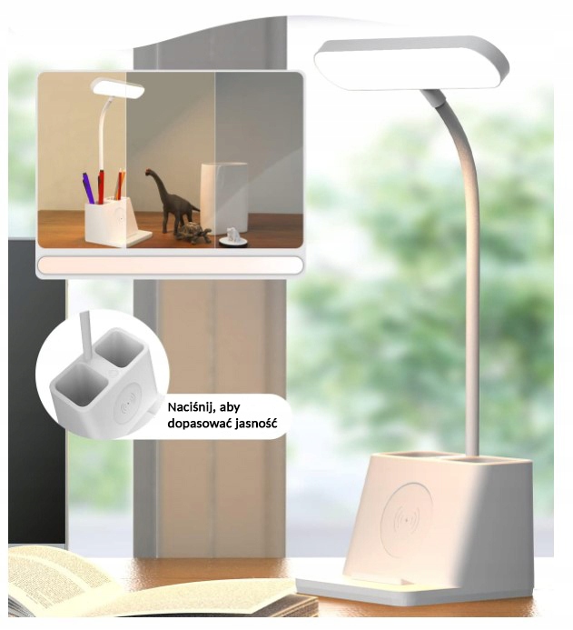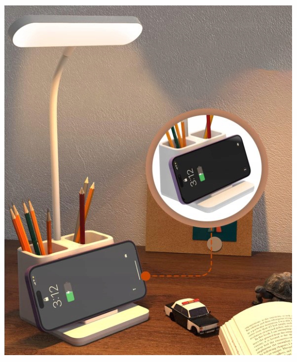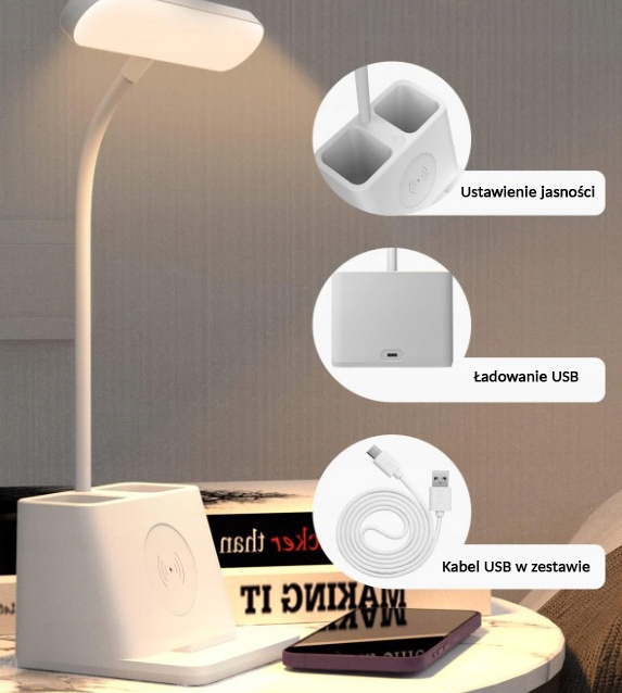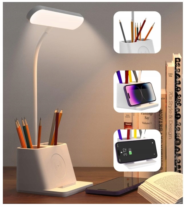 Ta namizna svetilka je praktična in funkcionalna naprava, ki združuje osvetlitev, organizacijo in polnilnik za telefon . Zahvaljujoč njej lahko uživamo v optimalni osvetlitvi, organizirani mizi in priročnem polnjenju! Organiziramo lahko svoje predmete in prihranimo dragocen prostor na mizi.