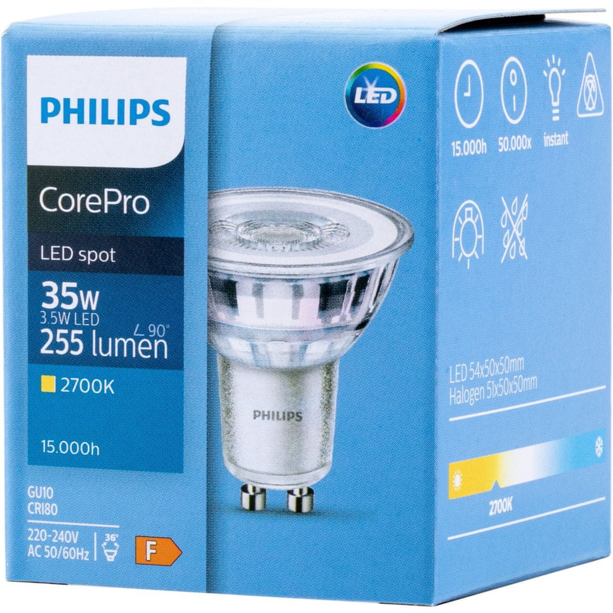 GU10 LED žarnica 3,5W = 35W 255lm 2700K topla bela 36° PHILIPSje popolna rešitev za vašo razsvetljavo, saj združuje energetsko učinkovitost in visoko kakovost. Z močjo3,5 W, lahko ta žarnica nadomesti tradicionalno 35 W žarnico z žarilno nitko in vam prihrani denar na računu za elektriko. Poganja230Vin združljiv z večino razpoložljivih namestitev.
