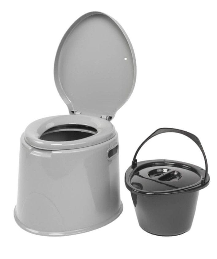 • Moderno prenosno stranišče s sedežem, pokrovom in vedrom, ki se ločeno zaklepa.