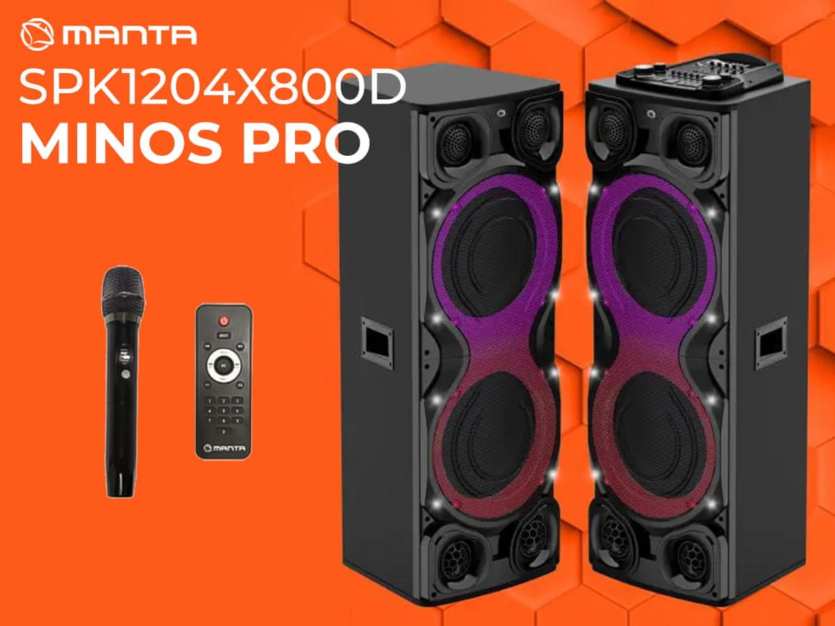 Manta SPK1204X800D MINOS PRO z izjemno močjo je pravi multimedijski center, saj ima vgrajeno Bluetooth povezavo za povezovanje s pametnimi napravami. Glasbo lahko predvajate tudi preko funkcije FM Radio, ter iz pametnih naprav, USB naprav ali AUX vhoda (MP3 predvajalnik, računalnik), na kontrolni plošči pa se nahajajo tudi vhod microSD za spominske kartice in 2× MIC-in vhod za priklop mikrofona.