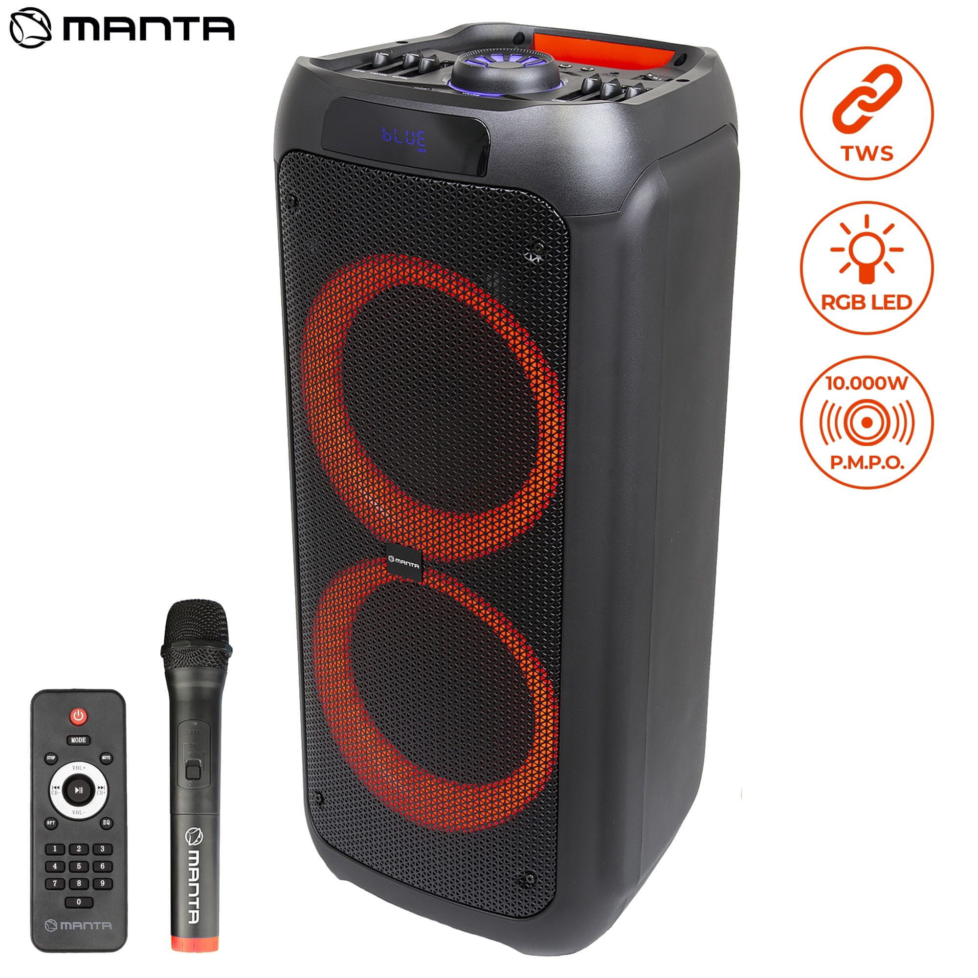 Manta SPK5310 PRO zvočnik, karaoke, vgrajena baterija, Bluetoth, USB, MP3, FM, disco LED, TWS, 10000W P.M.P.O.