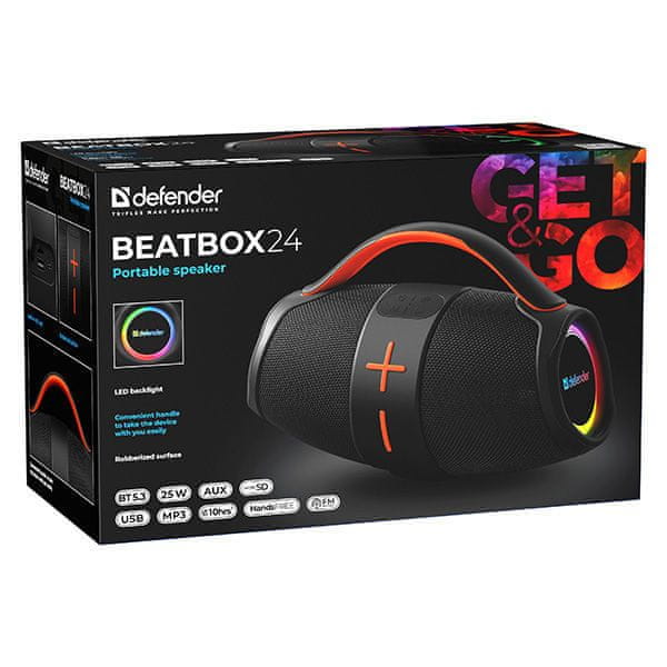Defender Beatbox 24 je vsestranski prenosni zvočnik, ki združuje funkcionalnost, zmogljivost in mobilnost. Ponaša se z močjo 25 W (RMS), Bluetooth 5.3 povezljivostjo in LED osvetlitvijo ozadja, ki ustvari prijeten vizualni učinek. Zvočnik podpira predvajanje iz USB ključkov in microSD kartic, ima vgrajen MP3 predvajalnik in FM sprejemnik, kar omogoča poslušanje direktno iz zvočnika brez priključene druge naprave.