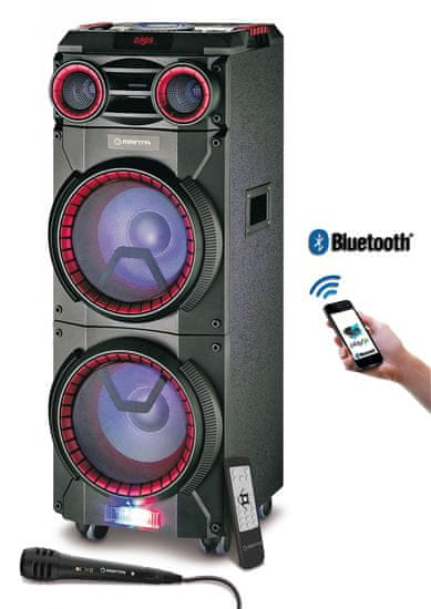 Akustični avdio sistem prinaša neverjetno zmogljivost, kristalno jasen in čist zvok. Je eden izmed najzmogljivejših avdio sistemov, ki vam bo v veliko pomoč pri prirejanju zabav. Podpira veliko različnih vrst povezav, ki vam omogoča priklop kateregakoli vira glasbe: Bluetooth, USB, MP3, MicroSD/SD/MMS, AUX-in in FM Radio. Ponuja možnost priklopa dveh mikrofonov in s tem poskrbi za pravo karaoke zabavo.
