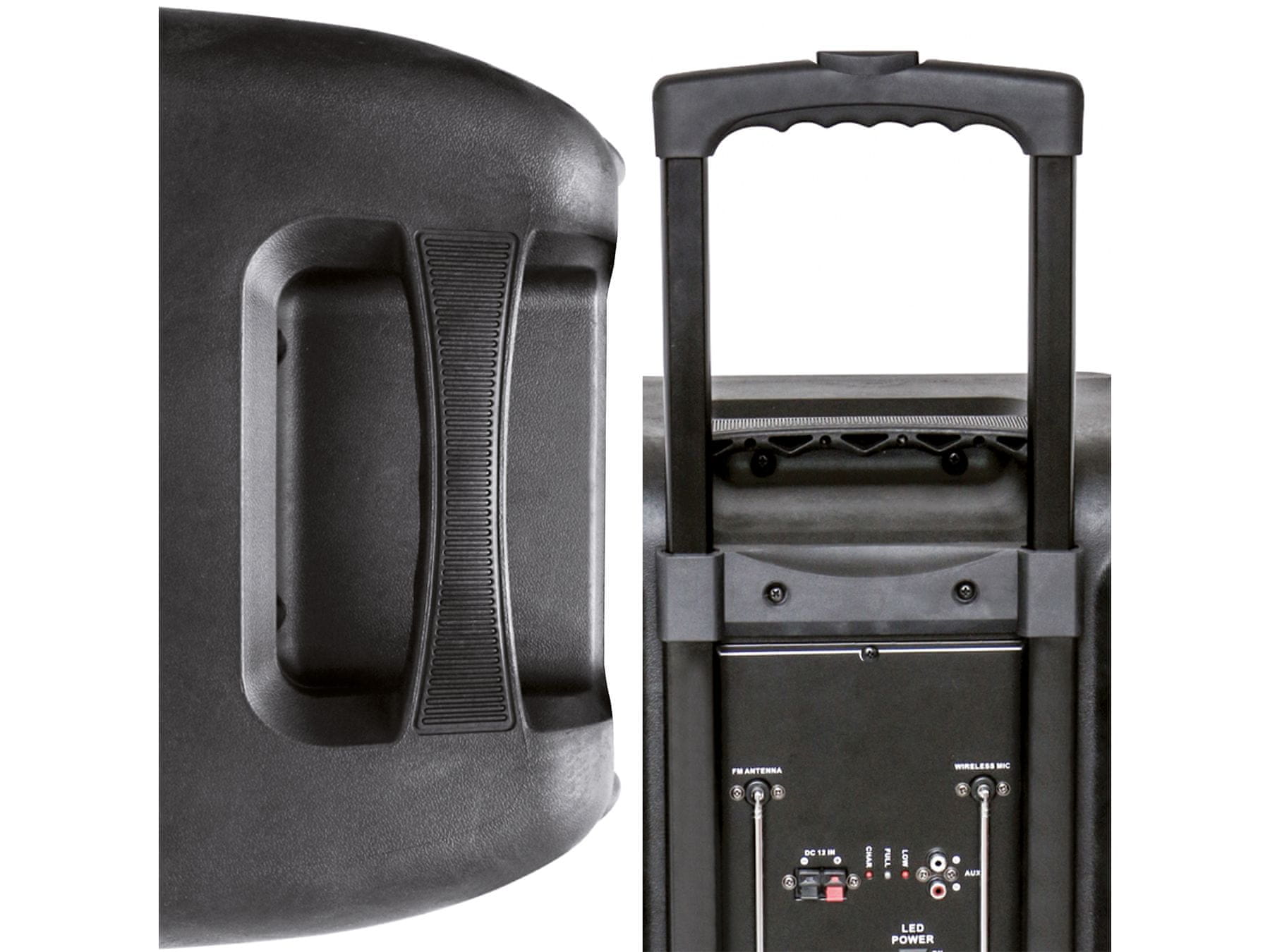 Dodatno sta na zvočniku tudi vgrajen ročaj in kolesa, ki bosta olajšala njegovo prenašanje, in vam zagotovila zabavo brez omejitev!