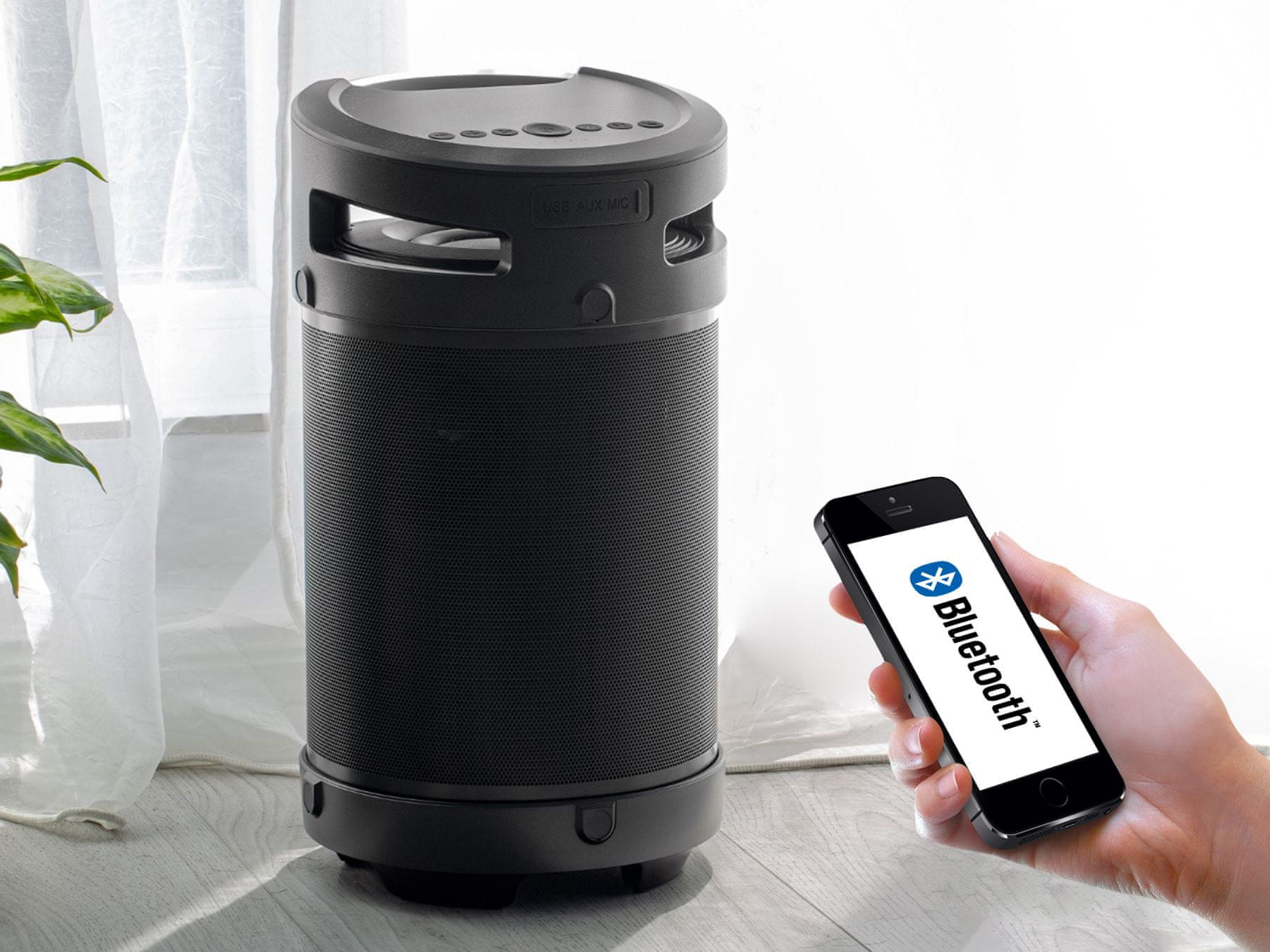 Na zvočniku se nahaja priročen vhod za priklop mikrofona, ki bo poskrbel za pravo KARAOKE zabavo. Užitek bo zagotovljen tako za vas, kot tudi za vaše najmlajše. Poskrbite za popolno zabavo in vzdušje, znotraj ali na prostem!