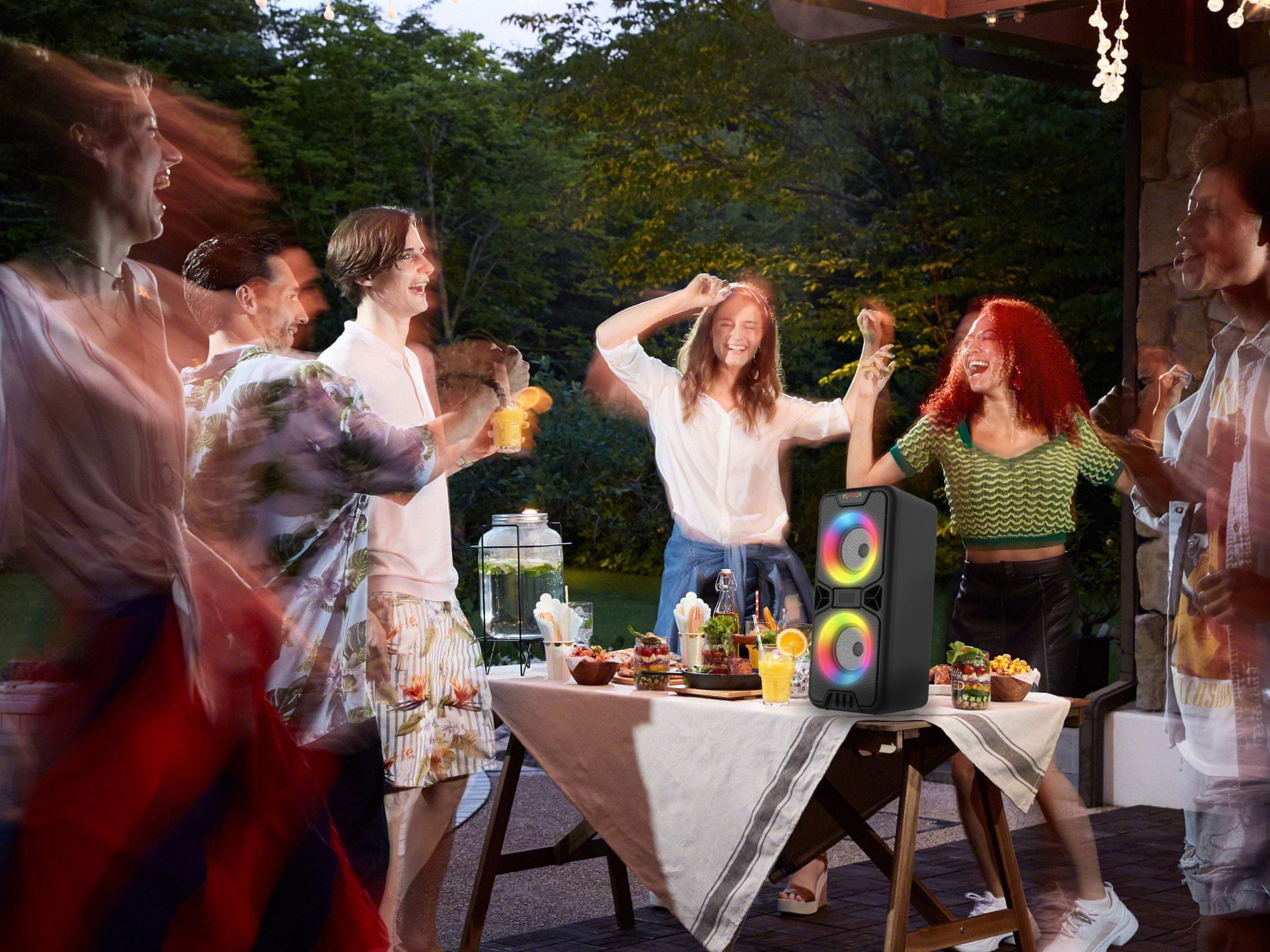 Pri petju in plesanju pa vam ne bo nikoli dolgčas tudi zaradi atraktivne RGB LED osvetlitve, ki je na voljo v več različnih načinih, med katerimi lahko prosto preklapljate s pritiskom na gumb na kontrolni plošči. Vgrajen je tudi gumb za izenačevalnik oz. Equalizer, ki vam nudi 2 načina predvajanja, prvi je namenjen za notranje prostore, drugi pa za predvajanje na prostem.