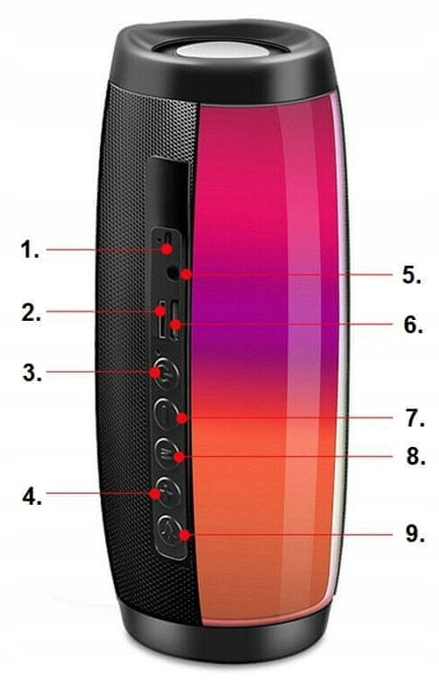 TG-157 brezžični Bluetooth Boombox LED zvočnik. Vsestranski zvočnik z Bluetooth in radiem. Stereo prostorski zvok za edinstveno glasbeno doživetje. Barvita LED osvetlitev ozadja, ki sveti v ritmu glasbe. Lahko sveti neprekinjeno ali v skladu z glasbo (ko zazna glasnejšo glasbo, zasveti v skladu z glasbo; če je glasba pretiha, se aktivira samodejno zaporedje luči). 5 načinov osvetlitve na izbiro, ki delujejo v skladu z glasbo. Omogoča vam poslušanje glasbe, poslane brezžično prek telefona in še več, in je združljiv z večino digitalnih naprav, ki podpirajo Bluetooth. Ima režo za spominsko kartico, zvočnik bere glasbene datoteke v formatu MP3. Ima USB vhod, ki omogoča priklop prenosnih naprav, kot so bliskovni diski. Vgrajeni mikrofon omogoča telefoniranje. Vgrajeni FM radio vam omogoča predvajanje glasbe in poslušanje radia, ne da bi morali nositi telefon. Glasba vedno z vami. Kompakten prenosni brezžični zvočnik, ki omogoča poslušanje glasbe kjerkoli in kadarkoli. Predvajajte svoje najljubše pesmi med vadbo na prostem, med poletnimi počitnicami ali na srečanju s prijatelji. Glasba predvajana iz vašega telefona prek Bluetooth 4.2. Naprava podpira tudi predvajanje glasbe s pomnilniških kartic, pogonov USB (npr. bliskovnih pogonov) in avdio priključkov 3,5 mm AUX minijack. Skrbno izdelan zvočnik TG157 vam bo zagotovo zagotovil ure zabave na prostem. Zvočnik ima vgrajen mikrofon za telefoniranje. Dolga življenjska doba baterije. Zahvaljujoč visoko zmogljivi bateriji lahko ure in ure uživate v svoji najljubši glasbi! Vrata za polnjenje zvočnika Reža za kartico MicroSD Dolg pritisk – vklop/izklop, kratek pritisk – premor Dolg pritisk – povečanje glasnosti, kratek pritisk – naslednja skladba Aux USB Dolg pritisk – zmanjšanje glasnosti, kratek pritisk – prejšnja skladba Način Sprejmi klic. Popoln izdelek za vsakogar: visokokakovosten zvok, kompaktne mere, učinkovit napajalnik, privlačen dizajn, LED osvetlitev, ki teče z glasbo (5 možnosti) in najbolj atraktivne barve te sezone so le nekatere od prednosti našega izdelka. Glasbo lahko predvajate tako, da svojo napravo brezžično povežete s tehnologijo Bluetooth, vgrajenim radiem ali s prenosne naprave za shranjevanje, kot je kartica mikro SD. Ta izdelek je popoln za vsakogar. Visokokakovosten zvok, globok bas, kompaktne dimenzije, učinkovita moč, privlačen dizajn, LED osvetlitev, ki se spreminja z ritmom glasbe (5 možnosti), in najbolj atraktivne barve te sezone so le nekatere od prednosti našega izdelka.