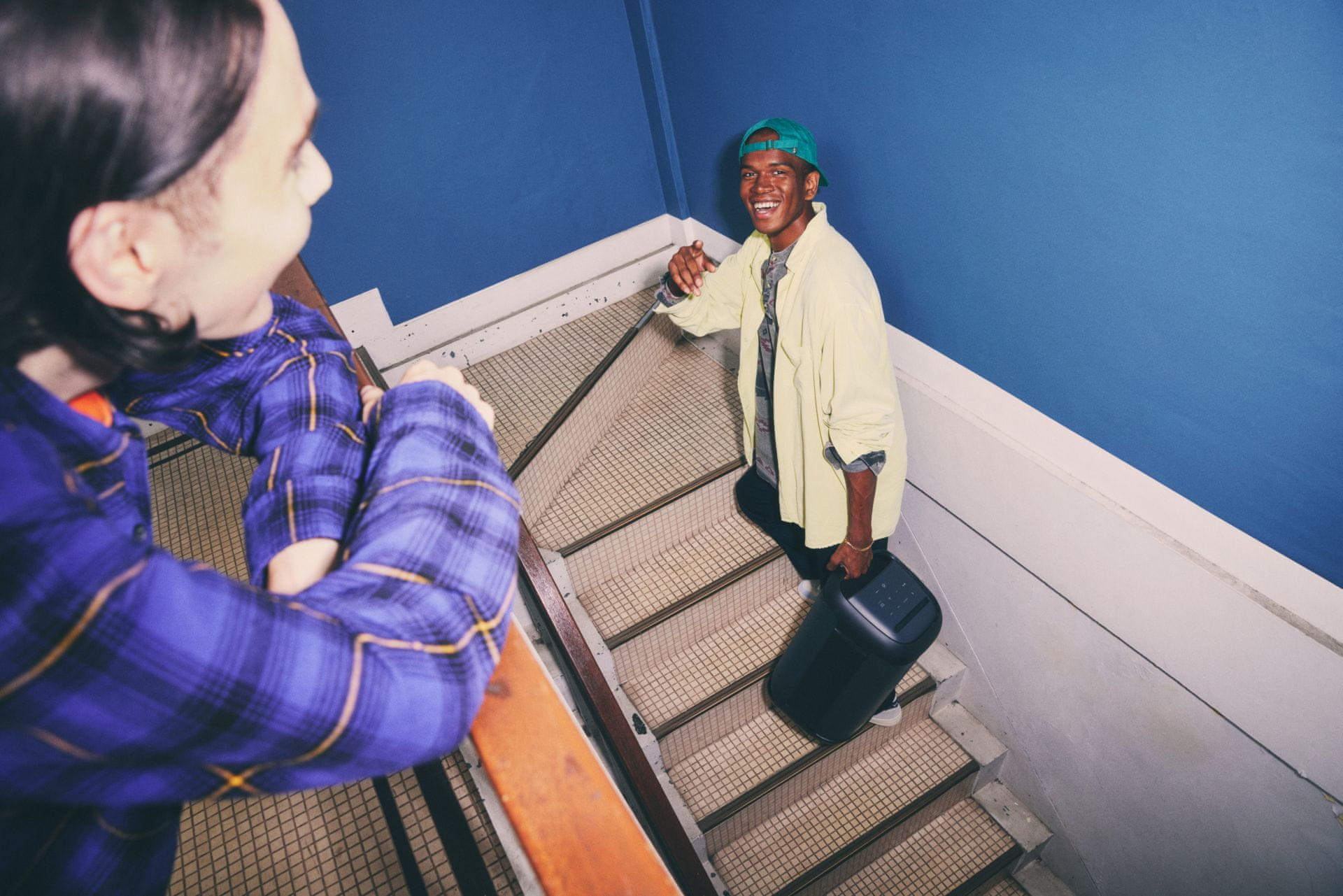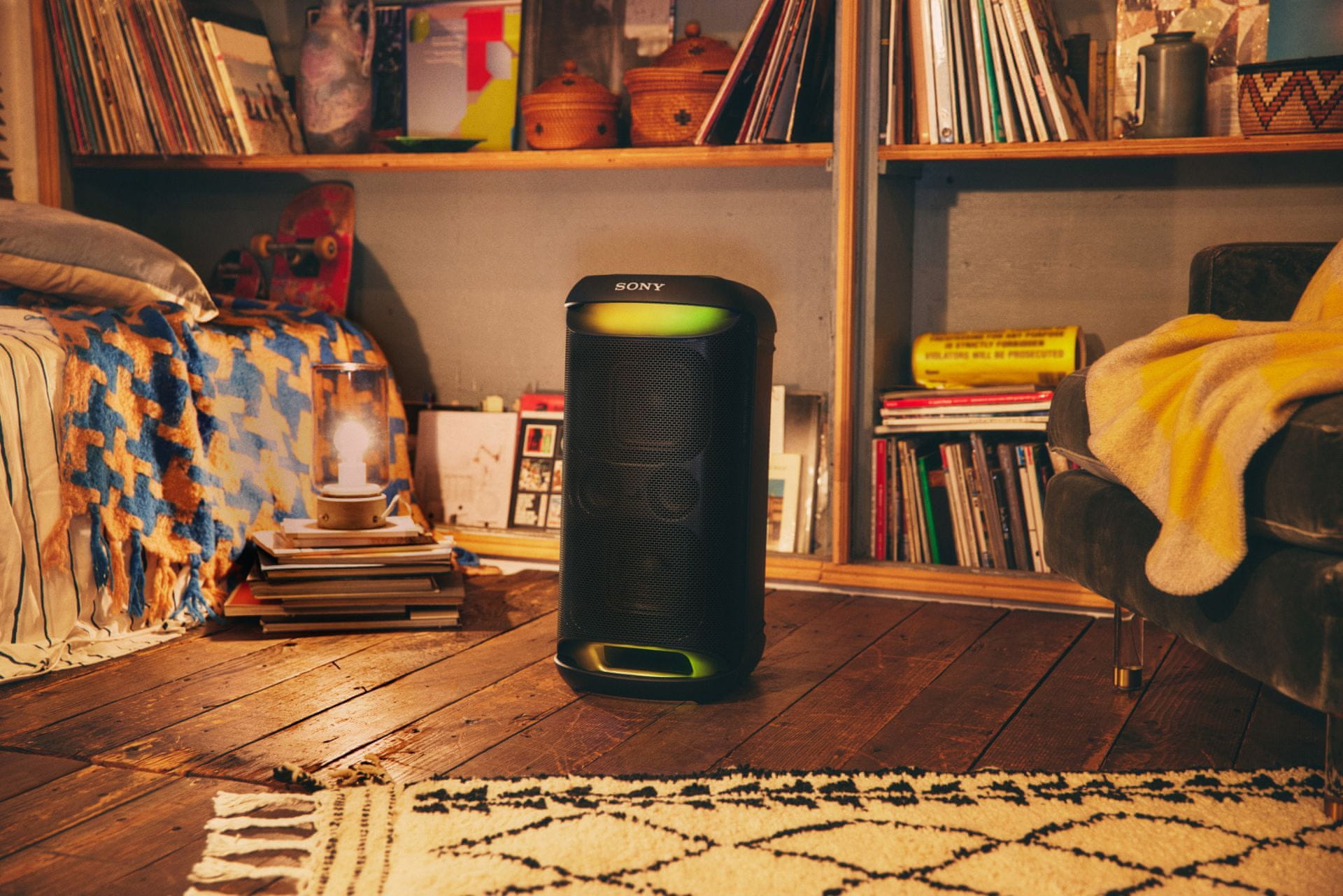 Zvočnik je opremljen z ročajem za enostavno prenašanje. Edinstvena zasnova omogoča postavitev zvočnika vodoravno ali navpično. Večbarvna osvetlitev bo dodatno izboljšala izkušnjo poslušanja vaše najljubše glasbe. Vodoodpornost po standardu IPX4 nudi dodatno zaščito v primeru stika z vodnimi kapljicami.