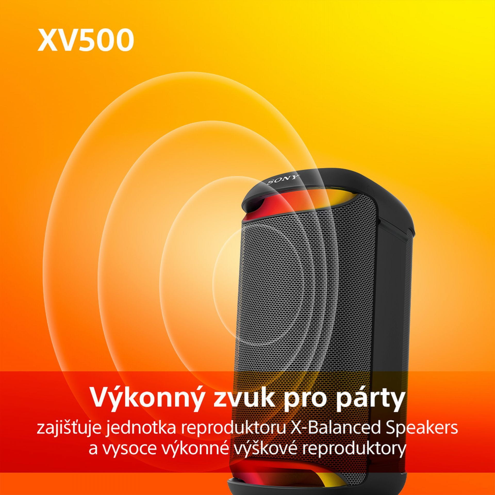 Zvočnik se ponaša z zvočniško enoto X-Balanced, ki v kombinaciji z visokotonci zagotavlja kakovostno zvočno izkušnjo. Dodana načina LIVE SOUND in MEGA BASS poskrbita za dodatno izboljšavo zvočne kakovosti. Zvočnik SRS-XV500 je med drugimj opremljen tudi z vhodi za priključitev mikrofona in kitare za pravo zabavo z družino ali prijatelji.
