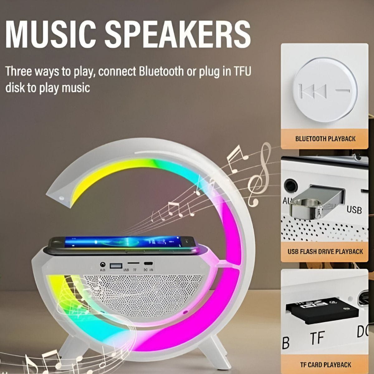 Multifunkcijska naprava – svetilka, Bluetooth zvočnik, QI brezžični polnilec (10W), barvita RGB LED osvetlitev, 3D zvok, radio, microSD predvajalnik, 6 načinov osvetlitve, sistem za zaščito oči. Celoten opis