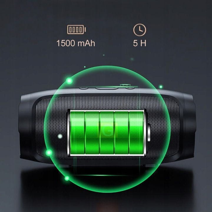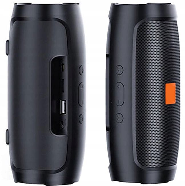 Brezžični Bluetooth zvočnik Charge Mini 3 – mobilni, zmogljiv, čist zvok, polnilna baterija. Združljiv z vsemi napravami, ki podpirajo Bluetooth: televizorji, telefoni, računalniki, osebni računalniki, prenosniki in konzole. Zakaj ta zvočnik? 4 vgrajeni zvočniki, Ergonomska oblika, Vgrajen čitalnik pomnilnika, Vgrajen USB priključek za bliskovne diske, Trpežno ohišje, Bluetooth 5.0, Samodejna Bluetooth povezava, Visoko zmogljiva baterija, Zanesljivo v vseh pogojih, Sodoben dizajn, Močan ojačevalnik nizkih tonov, 4 vgrajeni zvočniki. Ta mala „pošast“ zmore veliko in skoraj zagotovo vas bo presenetila njena moč. Tukaj so štirje zvočniki: dva se nahajata na sredini zvočnika, druga dva sta ob straneh. Ta rešitev zagotavlja užitek prostorskega zvoka in visoko skupno moč. Izjemen zvok. Izkusite najboljšo kakovost prostorskega zvoka, ki je še niste doživeli. Uživajte v izjemnem zvoku vaše najljubše glasbe, kadarkoli se vam zahoče, ne glede na to, kje ste. Kljub svoji majhnosti vas bo ta popolnoma brezžični zvočnik presenetil s kakovostnim zvokom. Bluetooth povezljivost: Zvočnik je opremljen z intuitivnimi gumbi, ki vam omogočajo udobno in varno sprejemanje dohodnih klicev in upravljanje skladb. Zahvaljujoč tehnologiji Bluetooth lahko telefonirate tudi, ko je vaš pametni telefon oddaljen 10–20 metrov! Vgrajeni mikrofon zagotavlja kakovostne pogovore. Bluetooth različica 5: Nizka poraba baterije, daljši doseg (do 20 metrov), večja odpornost na motnje (EDR filter), stabilnejši zvok, brez šuma, popolnoma jasen zvok, hitrejša interakcija s telefonom, nivo baterije zvočnika v telefonu. Združljivost: Zvočnik, predstavljen v tej ponudbi, odlično deluje s katero koli napravo, ki podpira Bluetooth. Telefoni, osebni računalniki, prenosni računalniki, konzole, televizorji in druge naprave, ki podpirajo Bluetooth. Veliko funkcij v enem zvočniku. Naprava navduši s kakovostjo zvoka in največjo glasnostjo, hkrati pa ni pretirano velika. To je zelo vsestranska naprava. Glasbo lahko predvaja prek Bluetootha, vrat USB in reže za kartico microSD. Kakovost in tehnologija: Najkakovostnejši materiali v kombinaciji z najnovejšo tehnologijo zagotavljajo odličen in naraven zvok z jasnimi nizkimi toni (bas). Izkusite sami. Zmogljiva baterija: Dimenzije naprave omogočajo zelo globok in močan bas. Gumirana noga omogoča, da zvočnik kljub cilindrični obliki ostane trdno na tleh. Vgrajena 6000 mAh baterija zagotavlja do 5 ur zabave. To je popolna naprava za ljudi, ki želijo svoje najljubše pesmi poslušati v najvišji kakovosti, kjer koli. Popoln za vsakogar. Ta popolnoma brezžični zvočnik lahko uporabljate praktično povsod; edina omejitev je vaša domišljija. Kolesarjenje, hoja, telovadnica, tek, treking ali sprostitev. Morda iščete darilo? Da razveselite svoje najdražje, se splača investirati v zanimiva darila. Da vam prihranimo ure brskanja po nakupovalnih centrih in brskanja po desetinah spletnih strani, vam predstavljamo zvočnik, ki bo zadovoljil še tako zahtevne potencialne prejemnike. Če iščete resnično izvirno darilo, ima ta ponudba vse. Tehnične specifikacije: Barva: Črna, Mere: 17 × 8 cm, Število zvočnikov: 4, Reža za pomnilniško kartico: Da, Vrata USB: Da, Bluetooth: Različica 5.0