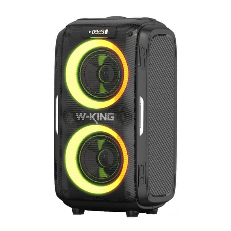 Zvočnik je opremljen z baterijo s kapaciteto 18.000 mAh, kar pomeni dolg čas delovanja. Popolnoma napolnjen omogoča do 9 ur delovanja. V kompletu je priložen adapter, s katerim boste napravo preprosto napolnili. Poleg tega je mogoče 2 zvočnika povezati v par za še boljše zvočne učinke. W-KING T9 Pro je odporen tudi na vodo IPX6 in ima barvno RGB-osvetlitev.