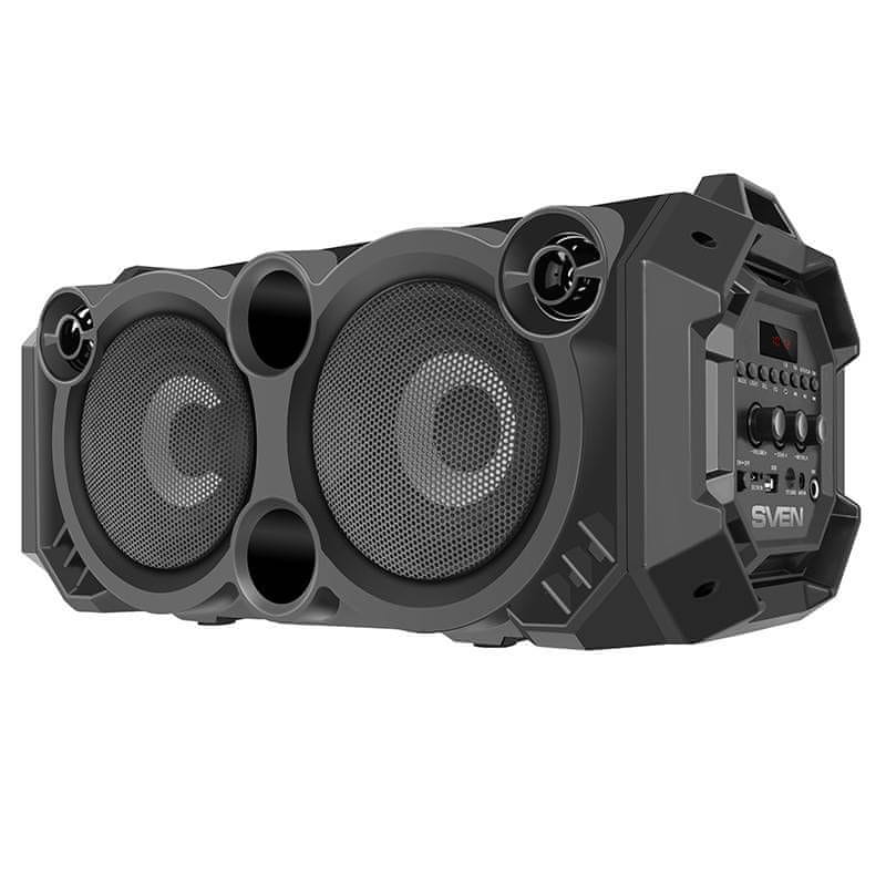 SVEN PS-550 je fantastičen zvočnik za vašo zabavo – ima vgrajene luči LED, ki bodo oživile vašo zabavo z vročico barv RGB, ki jih lahko poljubno nastavite! Želite za svoje goste pripraviti kul atrakcijo? Na zvočnik PS-550 lahko priključite mikrofon, zvok pa lahko prilagodite na nadzorni plošči – naj talent vaših gostov zasije! Zvočnik ima vgrajen tudi izenačevalnik, zato lahko nastavite popoln zvok. Pesmi lahko predvajate iz več virov – prek kabla, s ključka USB, kartice microSD ali telefona zaradi funkcije Bluetooth. Poleg tega lahko zaradi funkcije TWS brezžično povežete dva zvočnika hkrati in poskrbite za še bolj prostoren zvok.