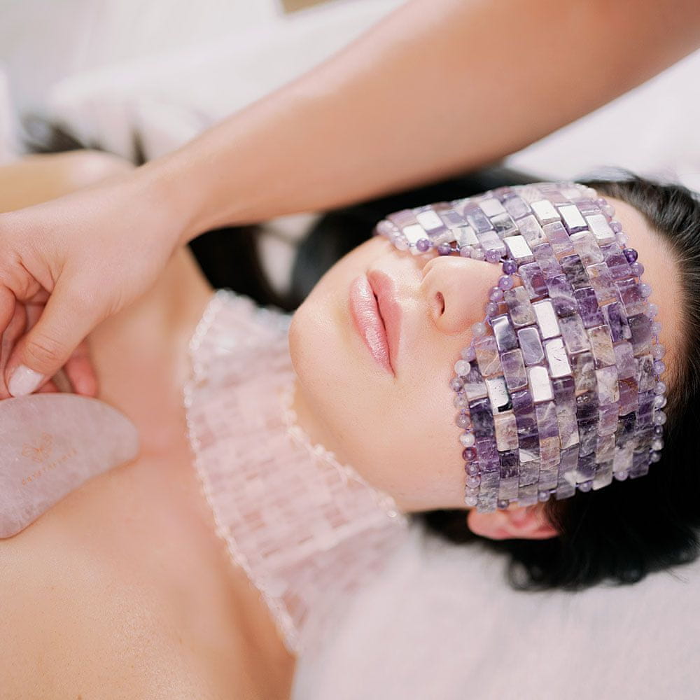 CRYSTALLOVE ametistna maska za obraz in telo je ročno stkana iz najkakovostnejšega naravnega kamna – ametista. Hladnost, ki jo sprošča kamen, zoži pore, zmanjša zabuhlost in temne kolobarje pod očmi ter poveča prekrvavitev, kar pomaga očistiti telo toksinov in odpraviti limfno zastoje. Uporaba maske sprošča obrazne mišice, zmanjšuje videz drobnih gubic in gub ter ima tako lepotni kot sproščujoč učinek.