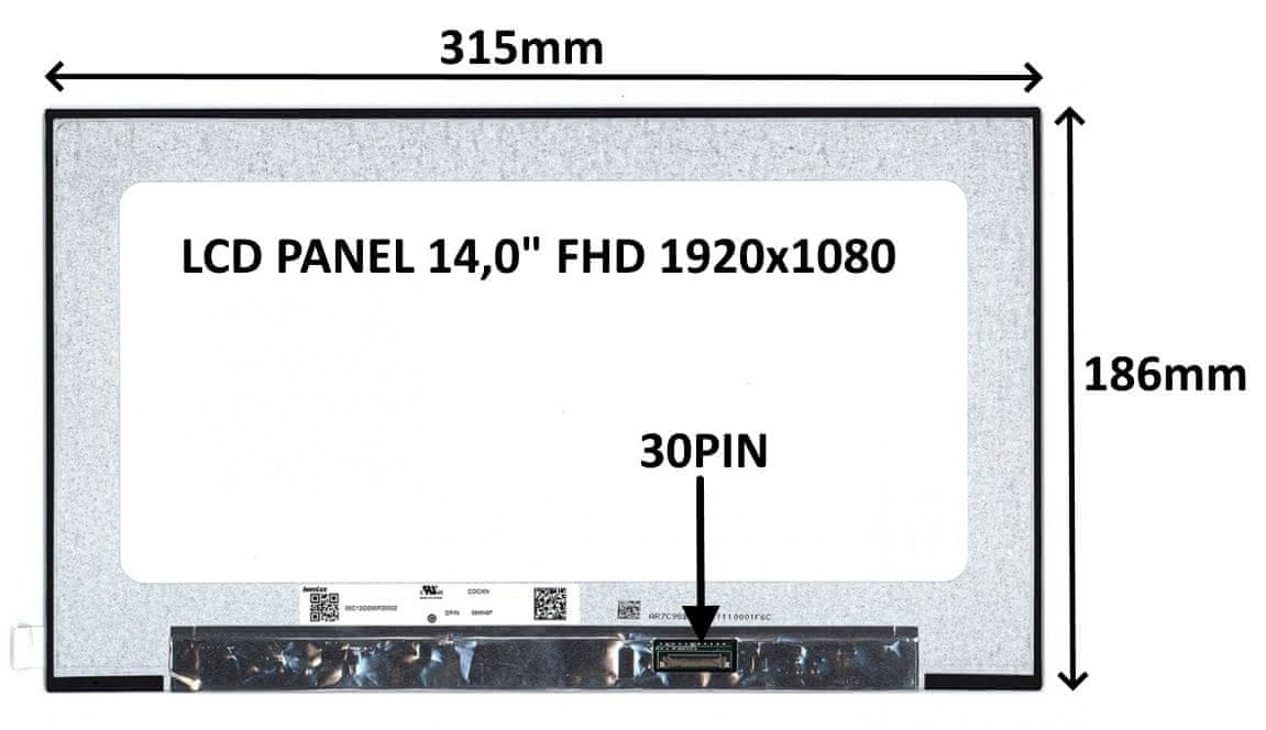 Diagonalni: 14,0" Rešljivost: 1920×1080 FHD konektor: 30 PIN Tip osvetlitve ozadja: LED Površina plošče LCD: MATNA Tehnologija plošče LCD: IPS Mere: Širina:315 mm Višina: 186 mm Način pritrditve plošče LCD: brez nosilcev – prilepljena na pokrov LCD garancija: 24 mesecev tudi za okvarjene piksle