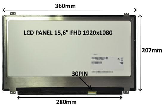 Diagonalni: 15,6" Resolucija: 1920×1080 FHD konektor: 30 PIN Trip osvetlitve ozadja: LED Površina plošče LCD: MATNA Tehnologija plošče LCD: TN Mere: Širina:360 mm Višina: 207 mm Dolžina pretvornika: 280 mm Metoda pritrditve plošče LCD: Zgornja in spodnja pritrditev Garancija: 24 mesecev tudi za okvarjene piksle